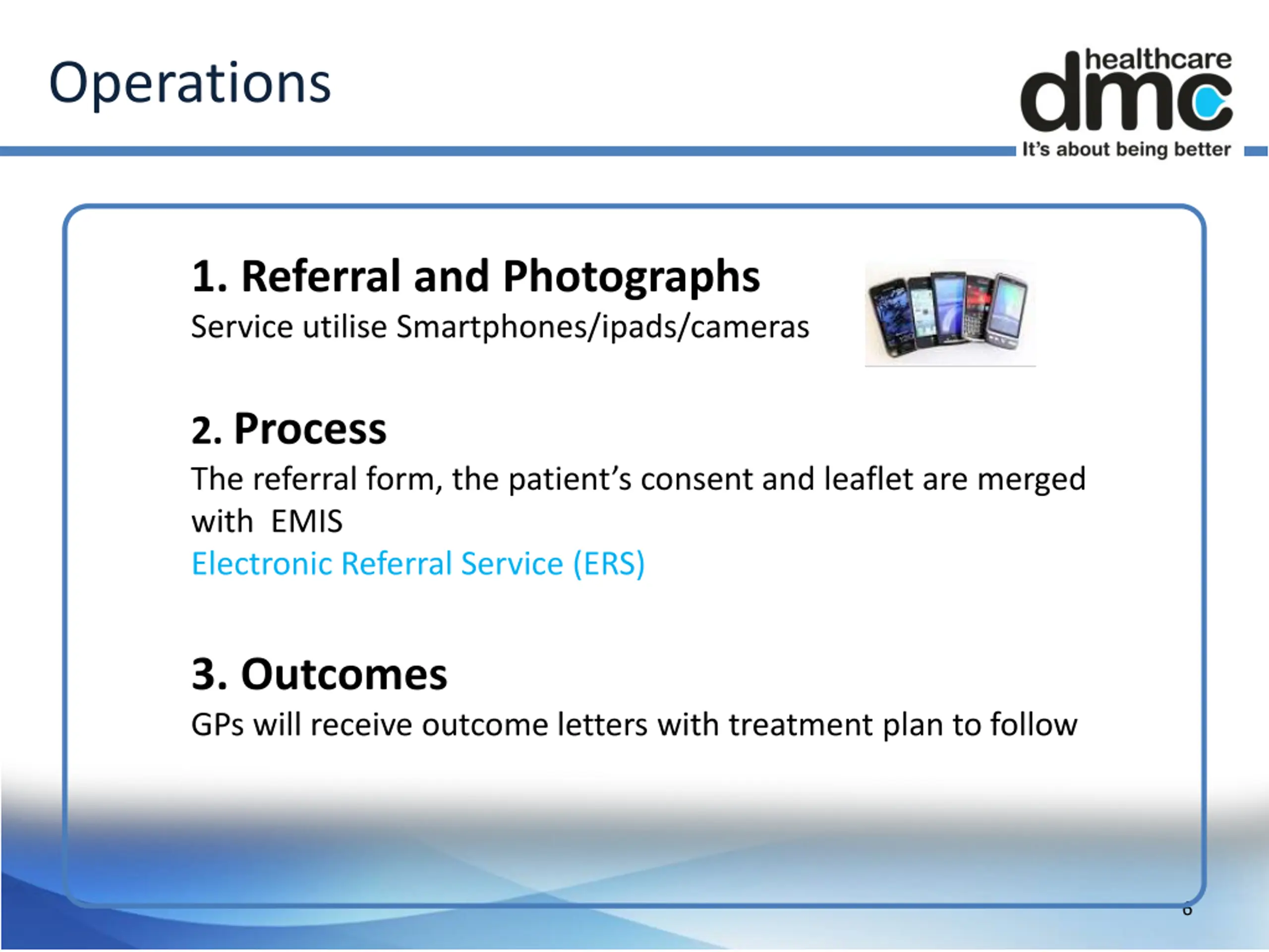 Operations 1. Referral and Photographs Service utilise Smartphones/ipads/cameras 2. Process The referral form, the patient s consent and leaflet are merged with EMIS Electronic Referral Service (ERS) 3. Outcomes GPs will receive outcome letters with treatment plan to follow 6