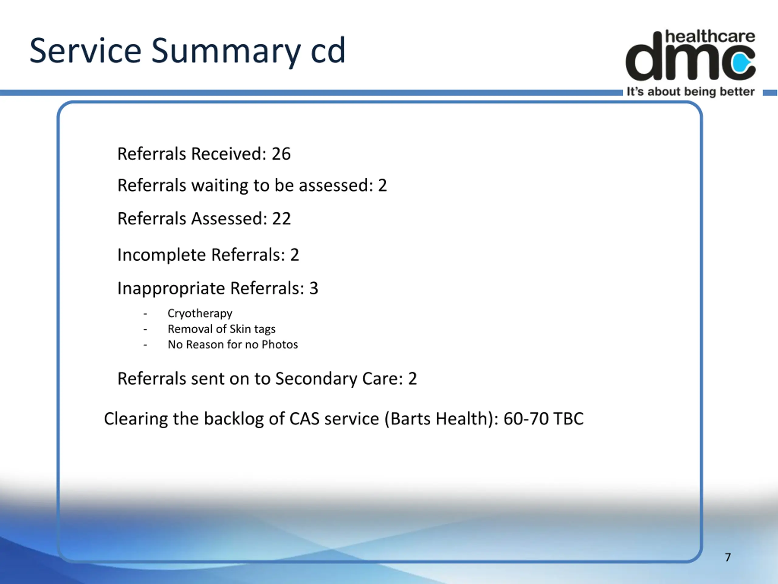 Service Summary cd Referrals Received: 26 Referrals waiting to be assessed: 2 Referrals Assessed: 22 Incomplete Referrals: 2 Inappropriate Referrals: 3 - - - Cryotherapy Removal of Skin tags No Reason for no Photos Referrals sent on to Secondary Care: 2 Clearing the backlog of CAS service (Barts Health): 60-70 TBC 7