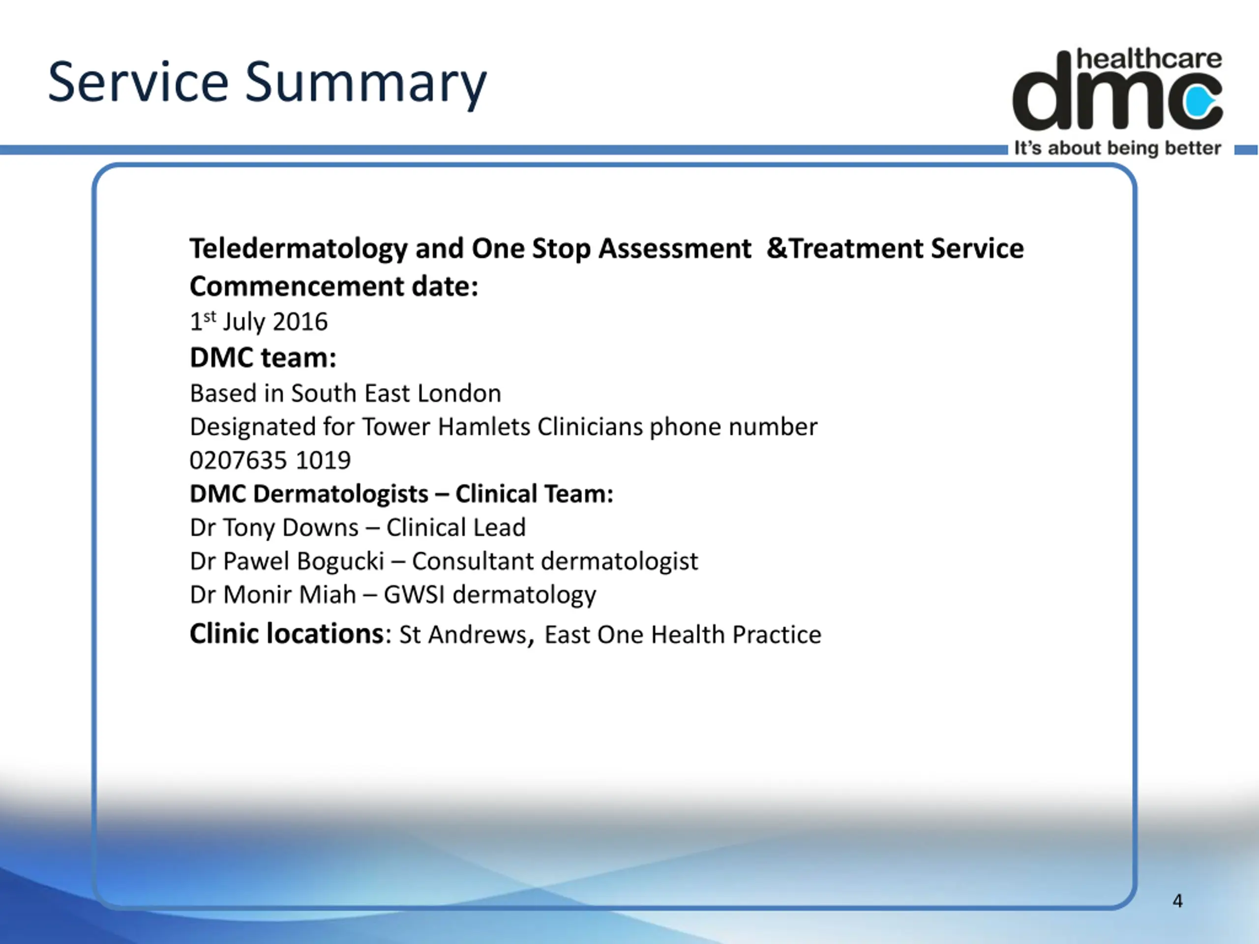 Service Summary Teledermatology and One Stop Assessment &Treatment Service Commencement date: 1st July 2016 DMC team: Based in South East London Designated for Tower Hamlets Clinicians phone number 0207635 1019 DMC Dermatologists Clinical Team: Dr Tony Downs Clinical Lead Dr Pawel Bogucki Consultant dermatologist Dr Monir Miah GWSI dermatology Clinic locations: St Andrews, East One Health Practice 4