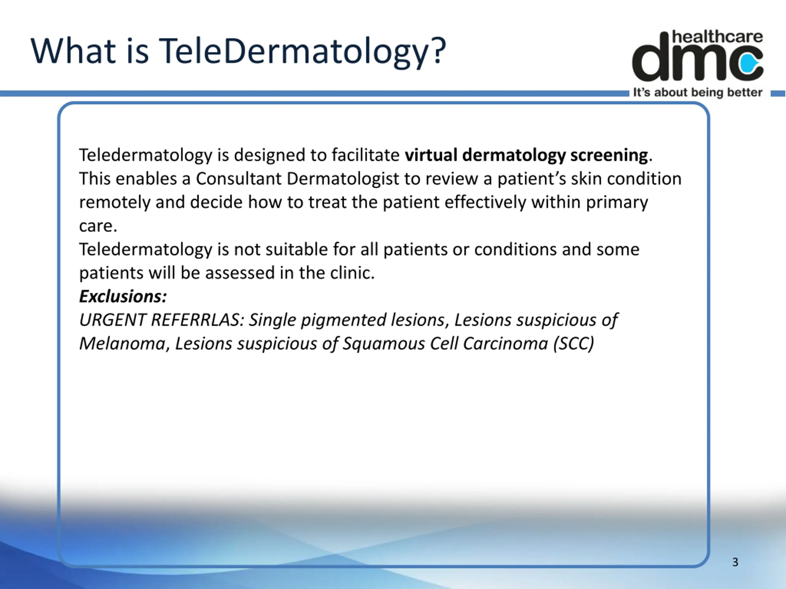 What is TeleDermatology? Teledermatology is designed to facilitate virtual dermatology screening. This enables a Consultant Dermatologist to review a patient s skin condition remotely and decide how to treat the patient effectively within primary care. Teledermatology is not suitable for all patients or conditions and some patients will be assessed in the clinic. Exclusions: URGENT REFERRLAS: Single pigmented lesions, Lesions suspicious of Melanoma, Lesions suspicious of Squamous Cell Carcinoma (SCC) 3