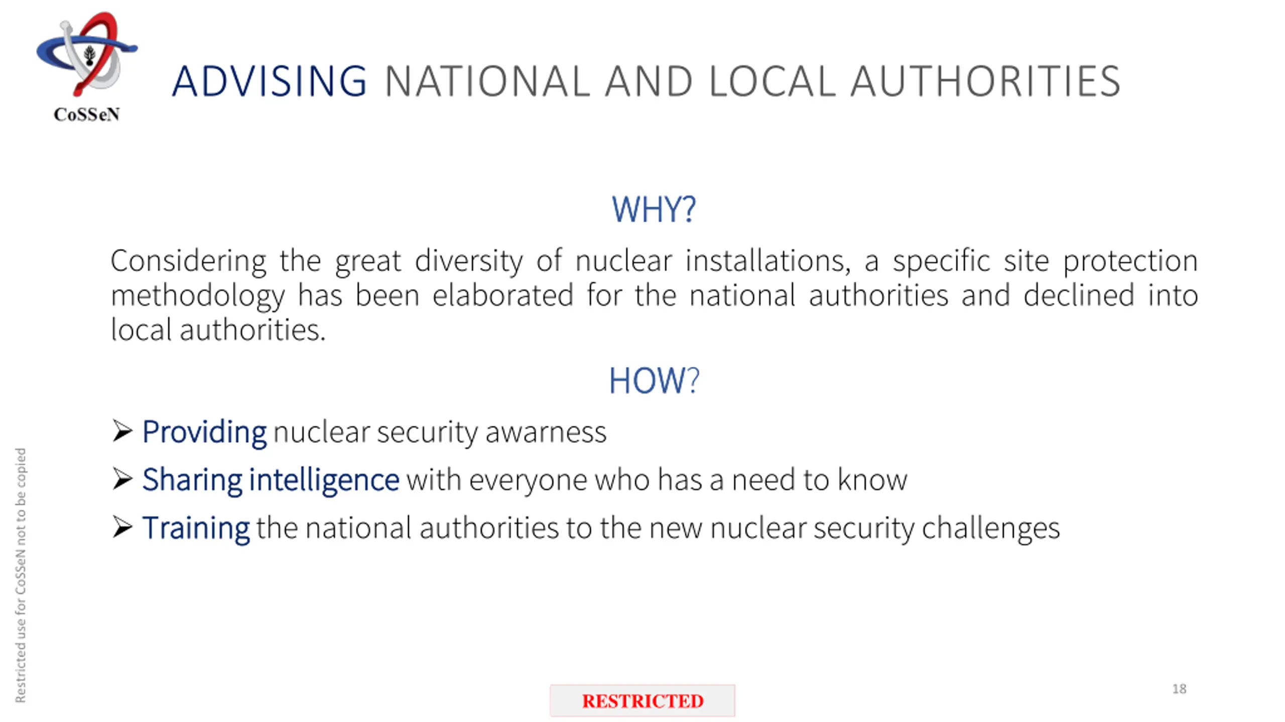 ENHANCE, HARMONIZE, AND COORDINATE DEEP DEFENSE AROUND FACILITIES AND TRANSPORTS WHY? WHY? Adapt the state protection system of nuclear sites and transports to the level and nature of threats the industry is facing. Propose another view for the state response with a deep defense and planification. HOW? HOW? Strategic Strategic foresight Monitoring Monitoring and analyzing analyzing security operations Harmonizing Harmonizing operational concepts Restricted use for CoSSeN not to be copied 17 RESTRICTED