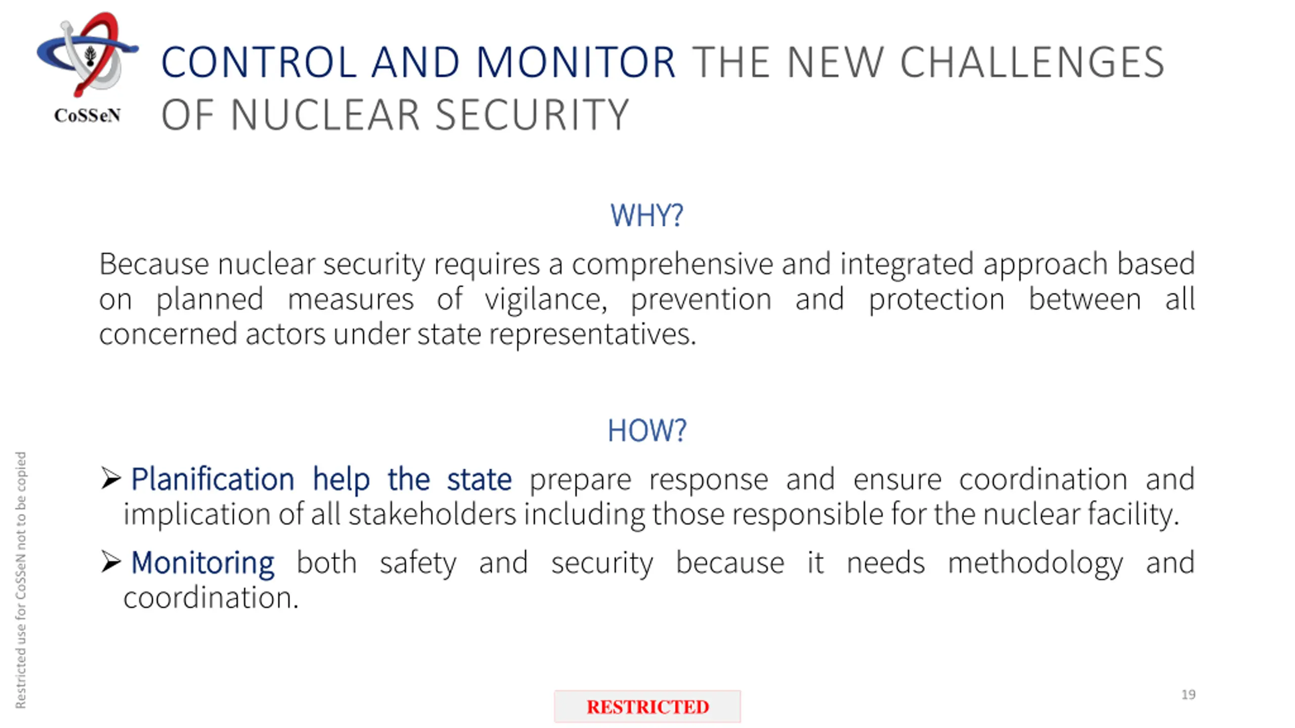 Coherence in nuclear security& safety Anticipation State global response Planification Restricted use for CoSSeN not to be copied Actors Coordination RESTRICTED