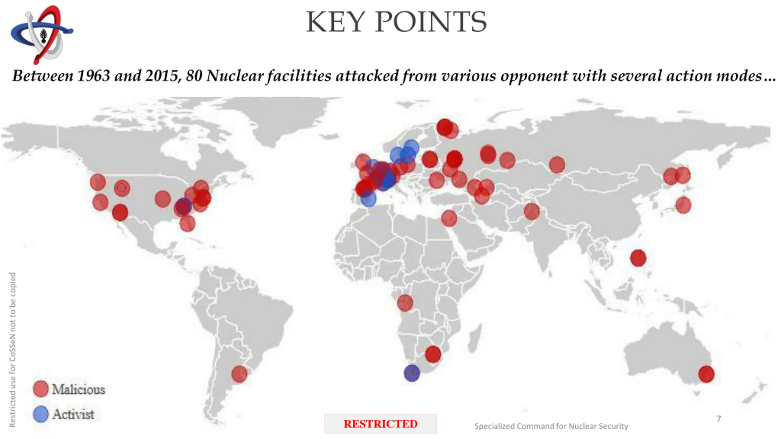 KEY POINTS Between 1963 and 2015, 80 Nuclear facilities attacked from various opponent with several action modes Restricted use for CoSSeN not to be copied 7 RESTRICTED Specialized Command for Nuclear Security