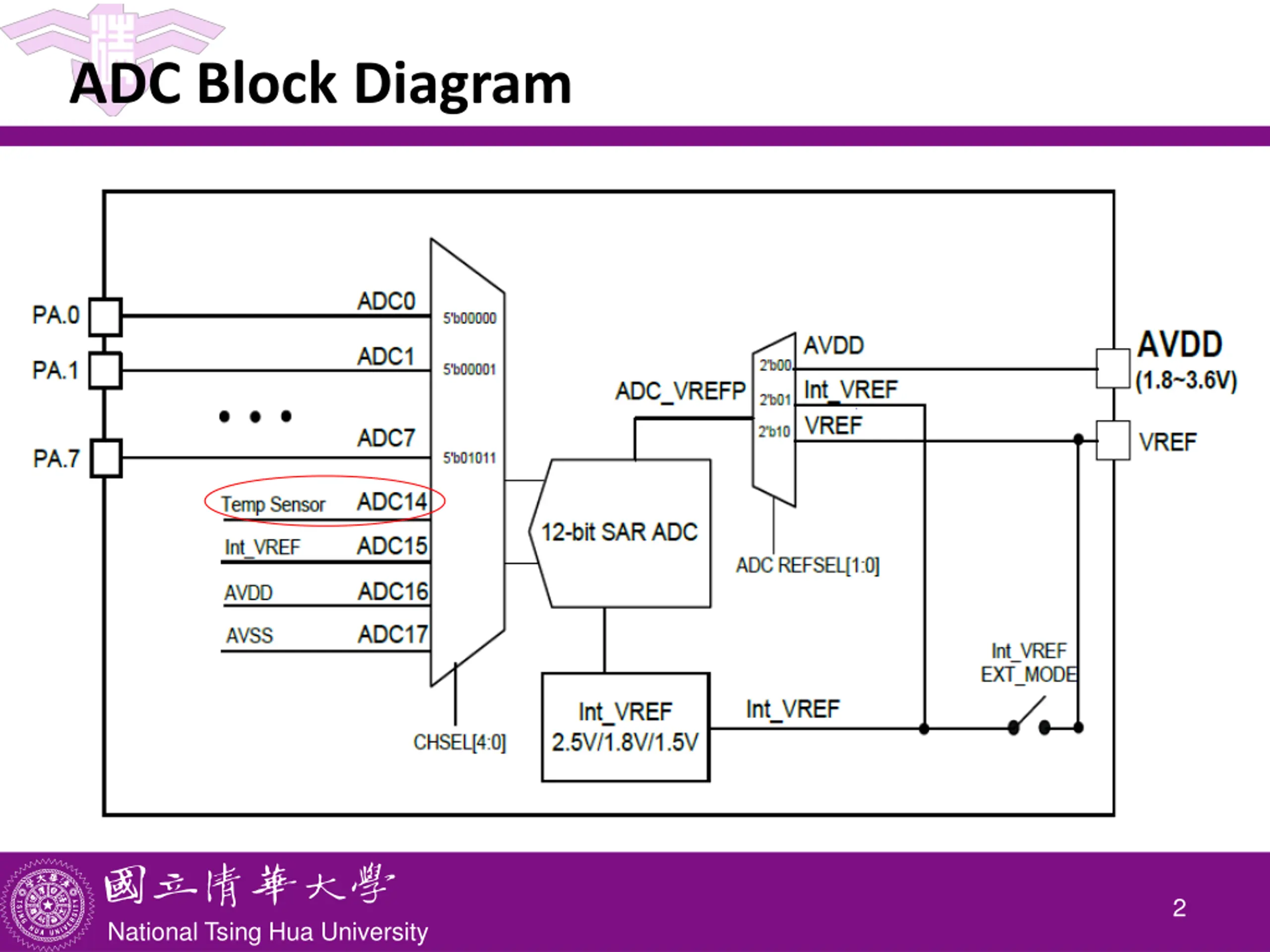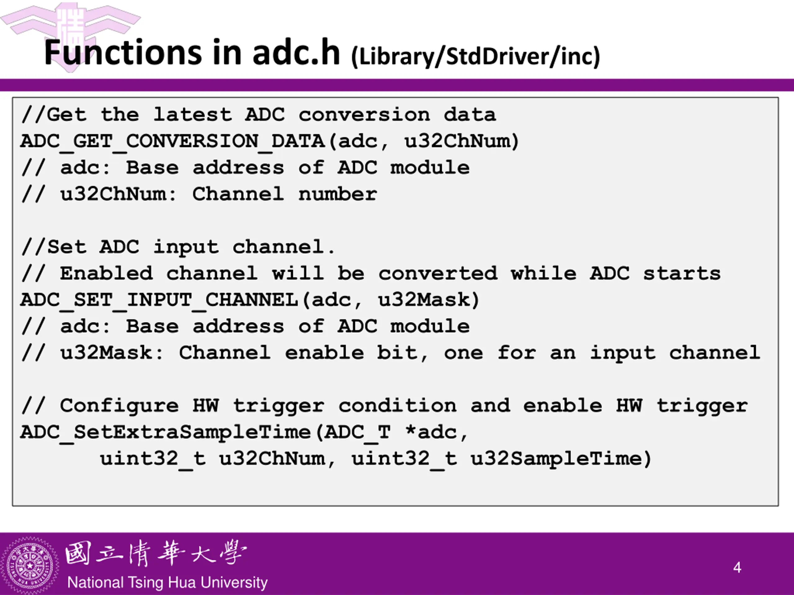 Functions in adc.h (Library/StdDriver/inc) //Get the latest ADC conversion data ADC_GET_CONVERSION_DATA(adc, u32ChNum) // adc: Base address of ADC module // u32ChNum: Channel number //Set ADC input channel. // Enabled channel will be converted while ADC starts ADC_SET_INPUT_CHANNEL(adc, u32Mask) // adc: Base address of ADC module // u32Mask: Channel enable bit, one for an input channel // Configure HW trigger condition and enable HW trigger ADC_SetExtraSampleTime(ADC_T *adc, uint32_t u32ChNum, uint32_t u32SampleTime) 4 National Tsing Hua University