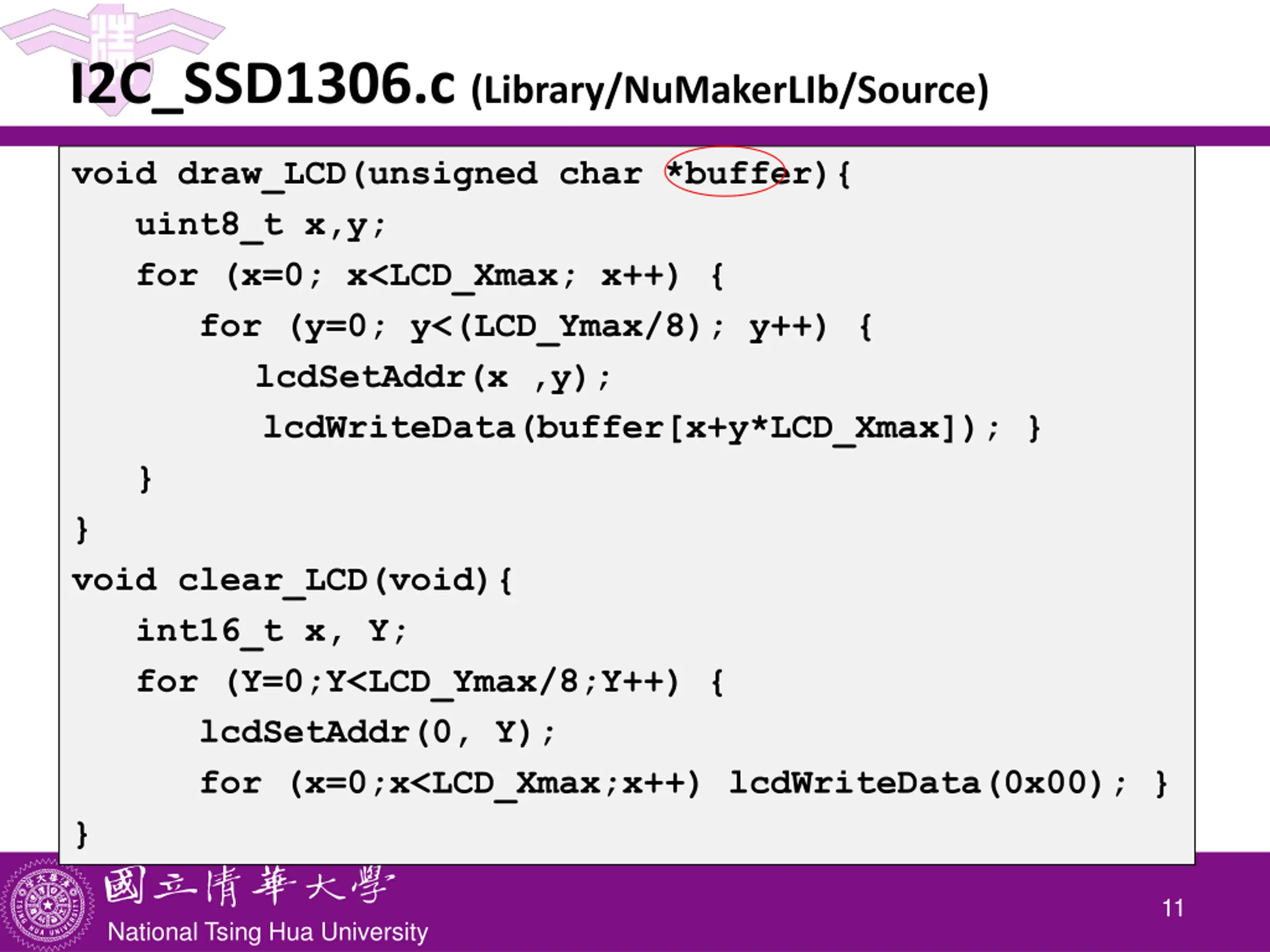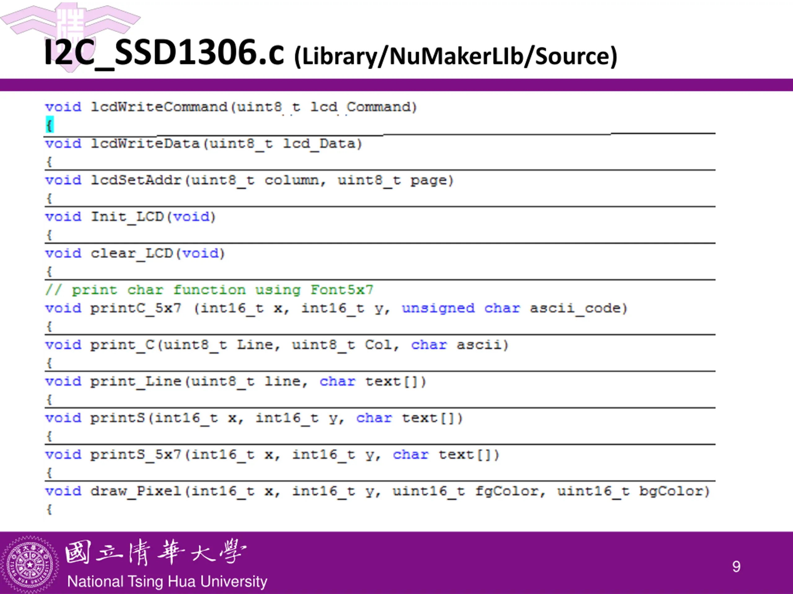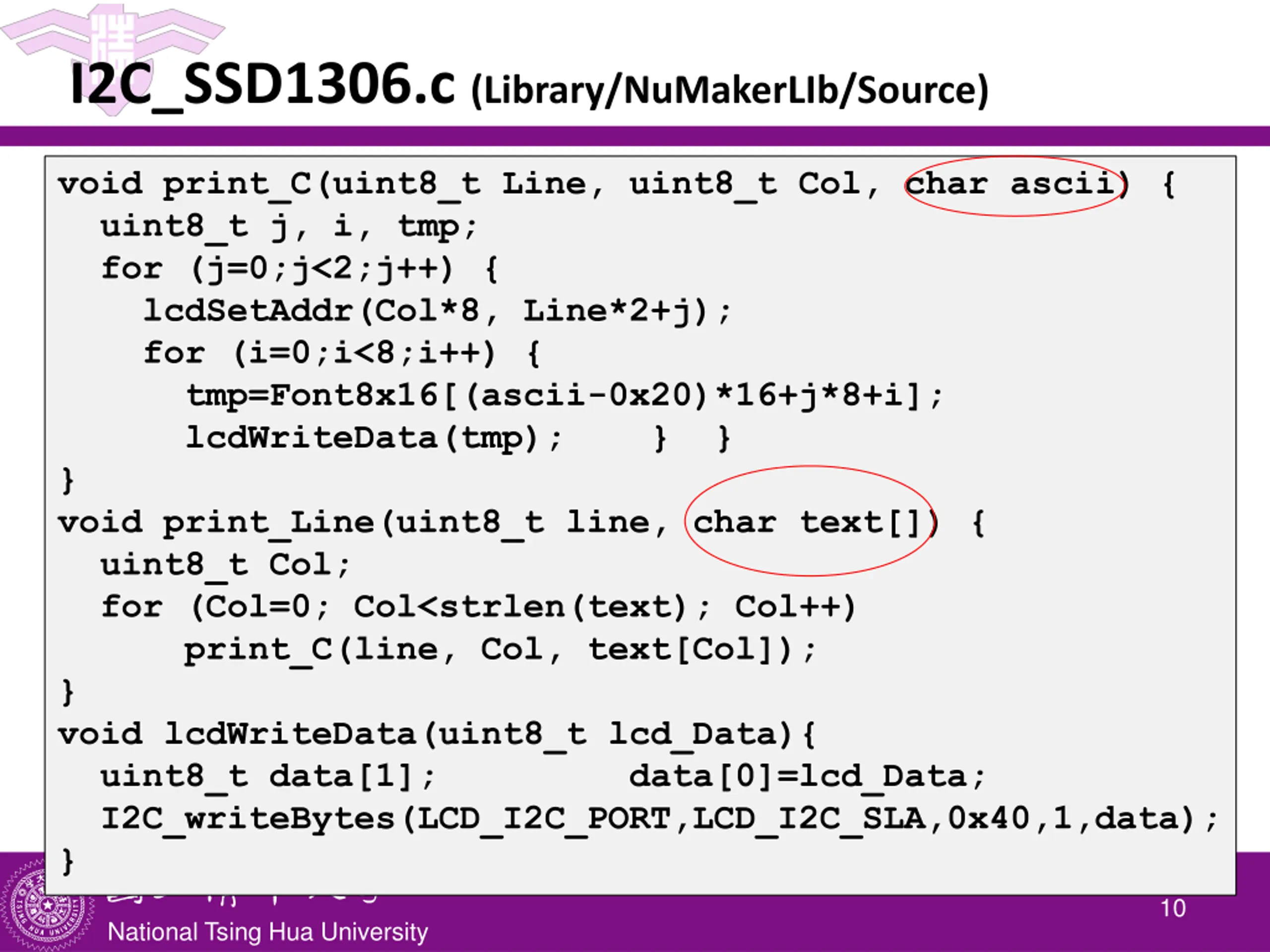 I2C_SSD1306.c (Library/NuMakerLIb/Source) void print_C(uint8_t Line, uint8_t Col, char ascii) { uint8_t j, i, tmp; for (j=0;j<2;j++) { lcdSetAddr(Col*8, Line*2+j); for (i=0;i<8;i++) { tmp=Font8x16[(ascii-0x20)*16+j*8+i]; lcdWriteData(tmp); } } } void print_Line(uint8_t line, char text[]) { uint8_t Col; for (Col=0; Col<strlen(text); Col++) print_C(line, Col, text[Col]); } void lcdWriteData(uint8_t lcd_Data){ uint8_t data[1]; data[0]=lcd_Data; I2C_writeBytes(LCD_I2C_PORT,LCD_I2C_SLA,0x40,1,data); } 10 National Tsing Hua University
