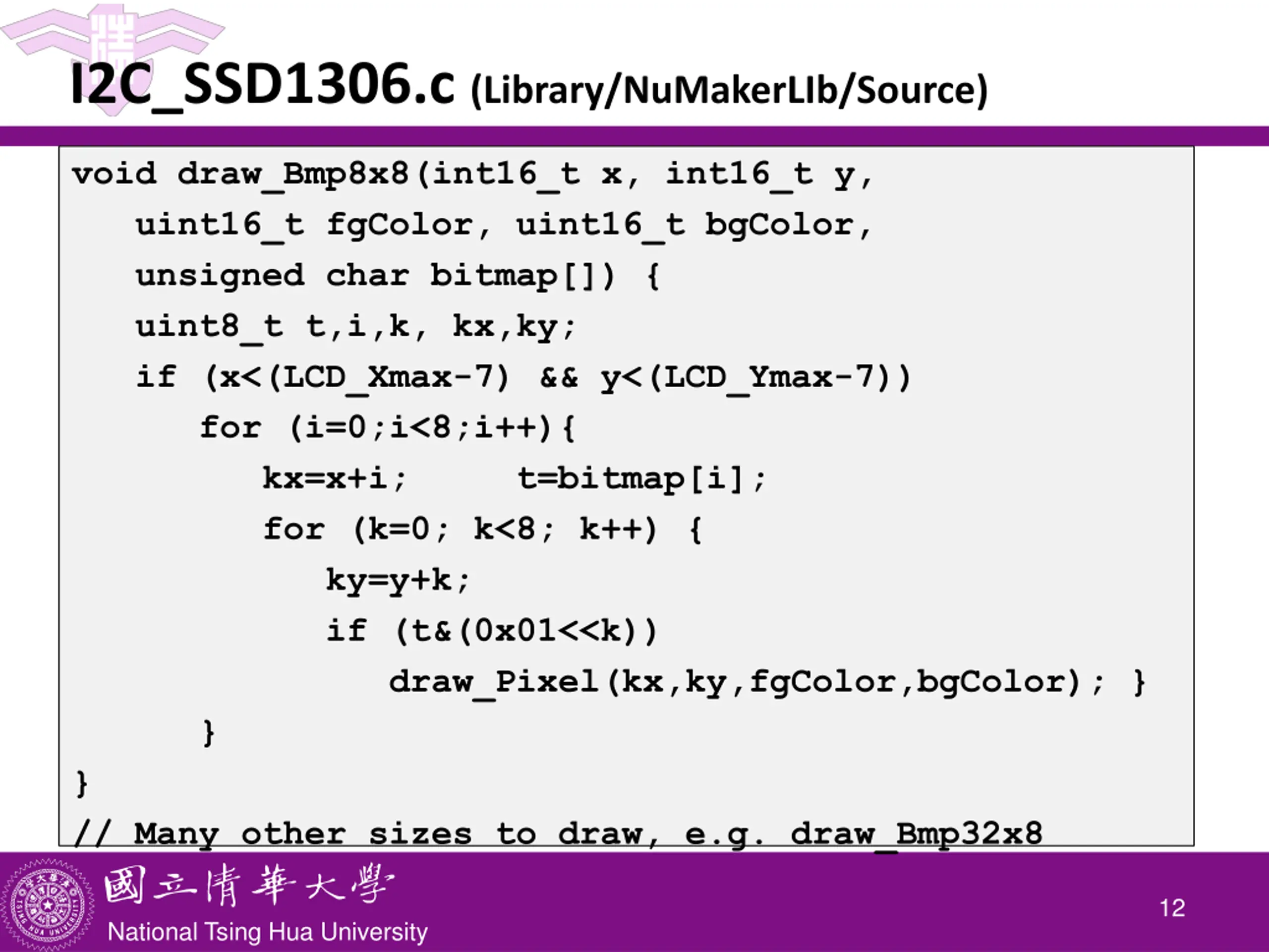 I2C_SSD1306.c (Library/NuMakerLIb/Source) void draw_Bmp8x8(int16_t x, int16_t y, uint16_t fgColor, uint16_t bgColor, unsigned char bitmap[]) { uint8_t t,i,k, kx,ky; if (x<(LCD_Xmax-7) && y<(LCD_Ymax-7)) for (i=0;i<8;i++){ kx=x+i; t=bitmap[i]; for (k=0; k<8; k++) { ky=y+k; if (t&(0x01<<k)) draw_Pixel(kx,ky,fgColor,bgColor); } } } // Many other sizes to draw, e.g. draw_Bmp32x8 12 National Tsing Hua University