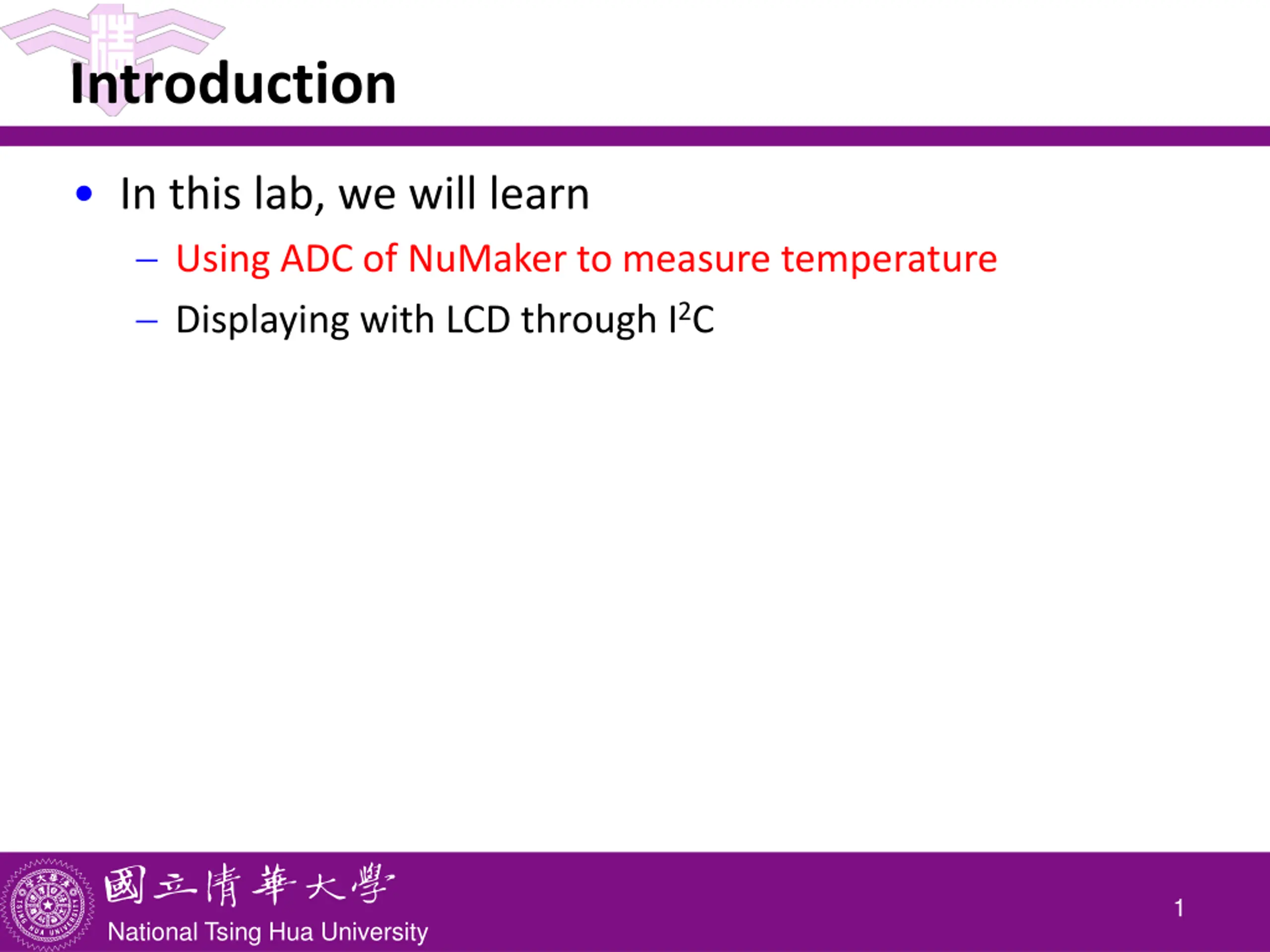 Introduction In this lab, we will learn Using ADC of NuMaker to measure temperature Displaying with LCD through I2C 1 National Tsing Hua University