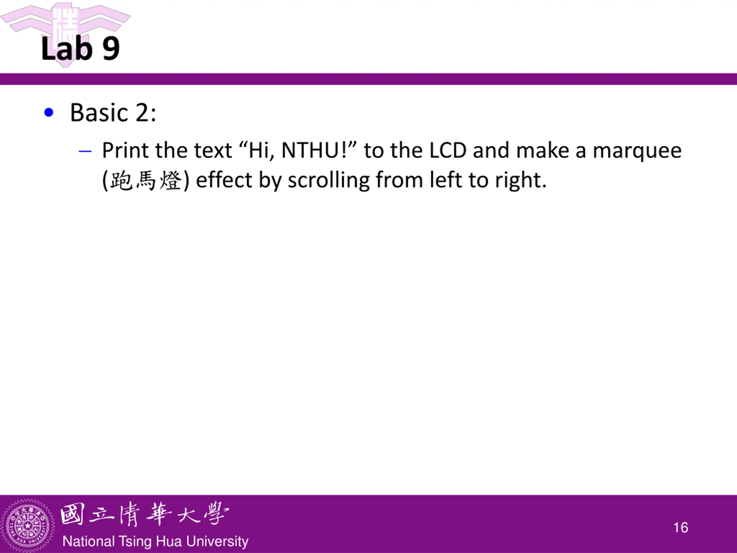 Lab 9 Basic 2: Print the text Hi, NTHU! to the LCD and make a marquee ( ) effect by scrolling from left to right. 16 National Tsing Hua University