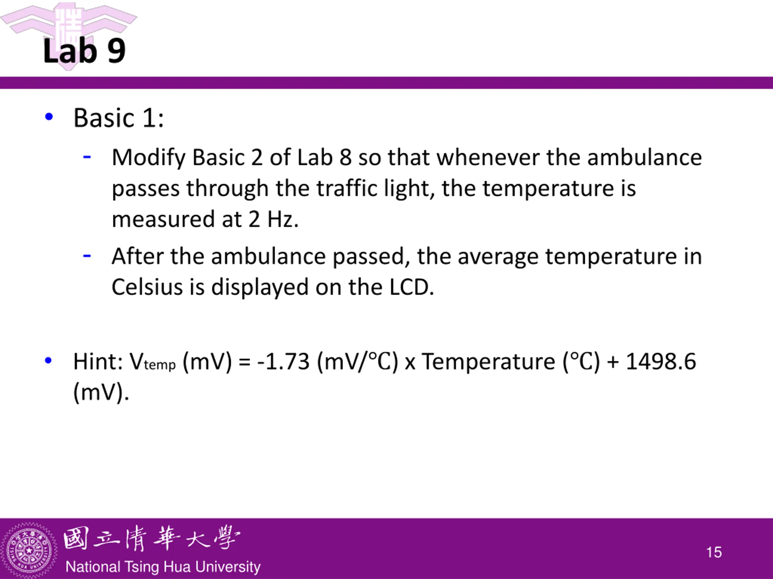 Lab 9 Basic 1: - Modify Basic 2 of Lab 8 so that whenever the ambulance passes through the traffic light, the temperature is measured at 2 Hz. - After the ambulance passed, the average temperature in Celsius is displayed on the LCD. Hint: Vtemp (mV) = -1.73 (mV/ ) x Temperature ( ) + 1498.6 (mV). 15 National Tsing Hua University