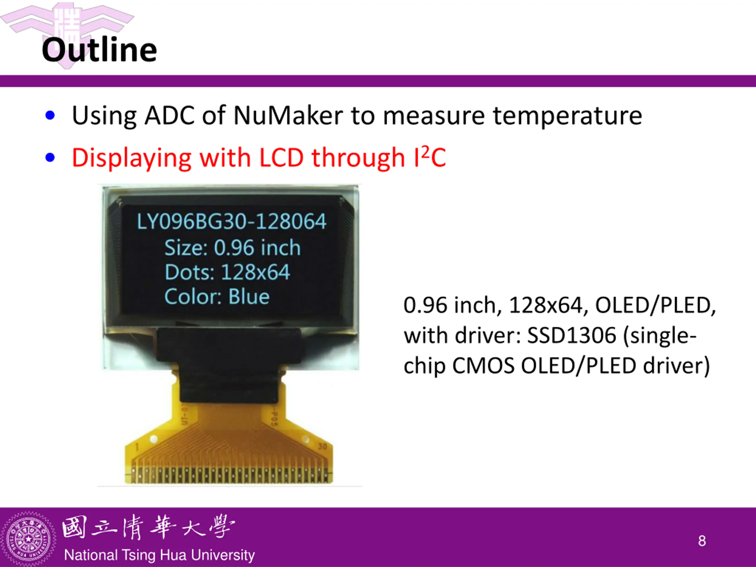 Outline Using ADC of NuMaker to measure temperature Displaying with LCD through I2C 0.96 inch, 128x64, OLED/PLED, with driver: SSD1306 (single- chip CMOS OLED/PLED driver) 8 National Tsing Hua University