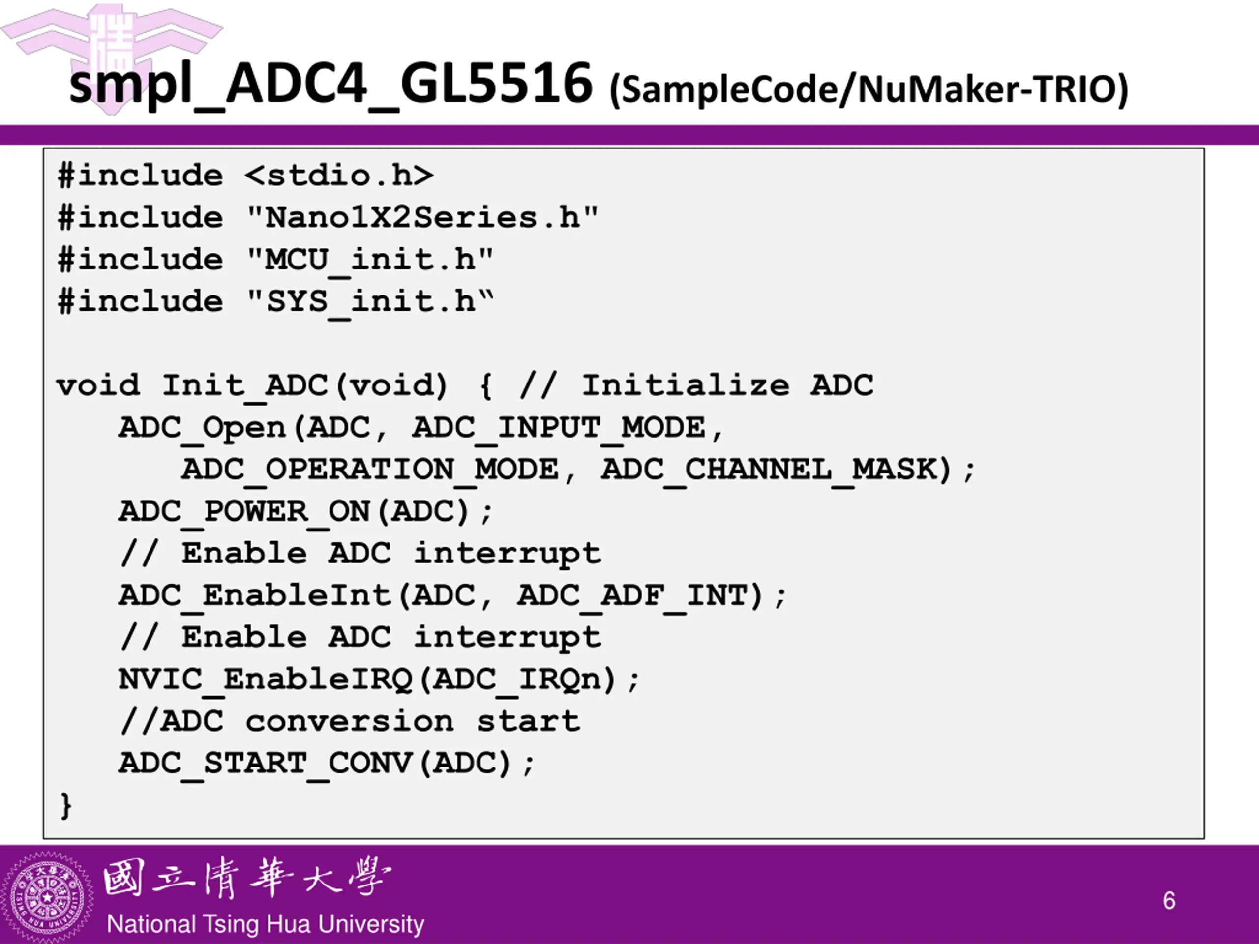 smpl_ADC4_GL5516 (SampleCode/NuMaker-TRIO) #include <stdio.h> #include "Nano1X2Series.h" #include "MCU_init.h" #include "SYS_init.h void Init_ADC(void) { // Initialize ADC ADC_Open(ADC, ADC_INPUT_MODE, ADC_OPERATION_MODE, ADC_CHANNEL_MASK); ADC_POWER_ON(ADC); // Enable ADC interrupt ADC_EnableInt(ADC, ADC_ADF_INT); // Enable ADC interrupt NVIC_EnableIRQ(ADC_IRQn); //ADC conversion start ADC_START_CONV(ADC); } 6 National Tsing Hua University