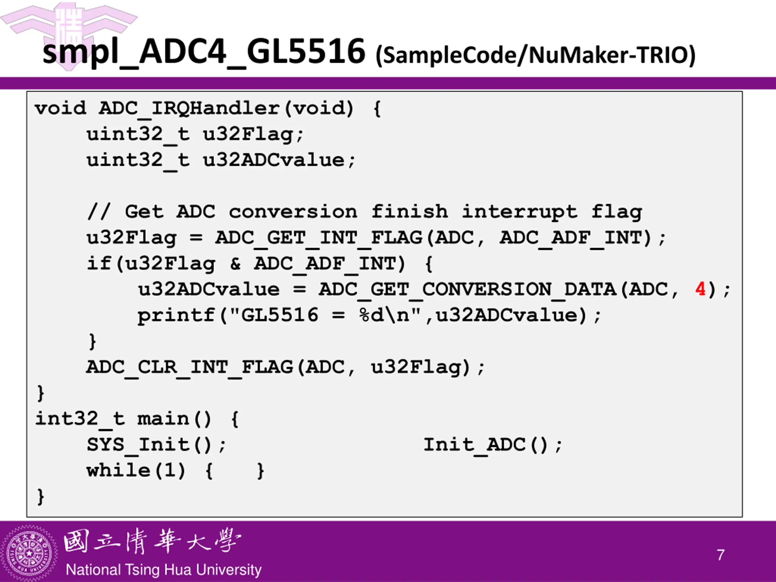 smpl_ADC4_GL5516 (SampleCode/NuMaker-TRIO) void ADC_IRQHandler(void) { uint32_t u32Flag; uint32_t u32ADCvalue; // Get ADC conversion finish interrupt flag u32Flag = ADC_GET_INT_FLAG(ADC, ADC_ADF_INT); if(u32Flag & ADC_ADF_INT) { u32ADCvalue = ADC_GET_CONVERSION_DATA(ADC, 4); printf("GL5516 = %d\n",u32ADCvalue); } ADC_CLR_INT_FLAG(ADC, u32Flag); } int32_t main() { SYS_Init(); while(1) { } } Init_ADC(); 7 National Tsing Hua University