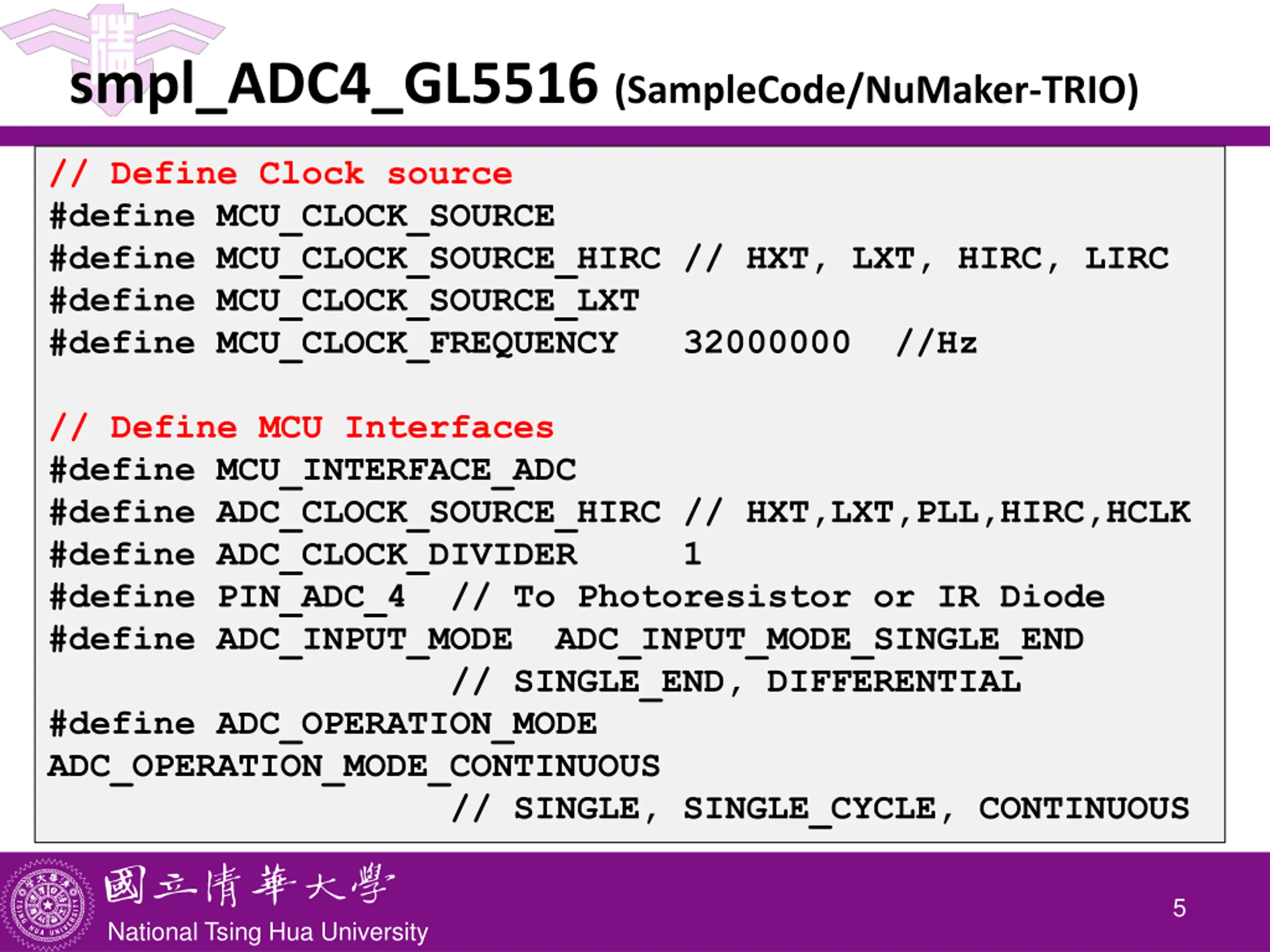 smpl_ADC4_GL5516 (SampleCode/NuMaker-TRIO) // Define Clock source #define MCU_CLOCK_SOURCE #define MCU_CLOCK_SOURCE_HIRC // HXT, LXT, HIRC, LIRC #define MCU_CLOCK_SOURCE_LXT #define MCU_CLOCK_FREQUENCY 32000000 //Hz // Define MCU Interfaces #define MCU_INTERFACE_ADC #define ADC_CLOCK_SOURCE_HIRC // HXT,LXT,PLL,HIRC,HCLK #define ADC_CLOCK_DIVIDER 1 #define PIN_ADC_4 // To Photoresistor or IR Diode #define ADC_INPUT_MODE ADC_INPUT_MODE_SINGLE_END // SINGLE_END, DIFFERENTIAL #define ADC_OPERATION_MODE ADC_OPERATION_MODE_CONTINUOUS // SINGLE, SINGLE_CYCLE, CONTINUOUS 5 National Tsing Hua University