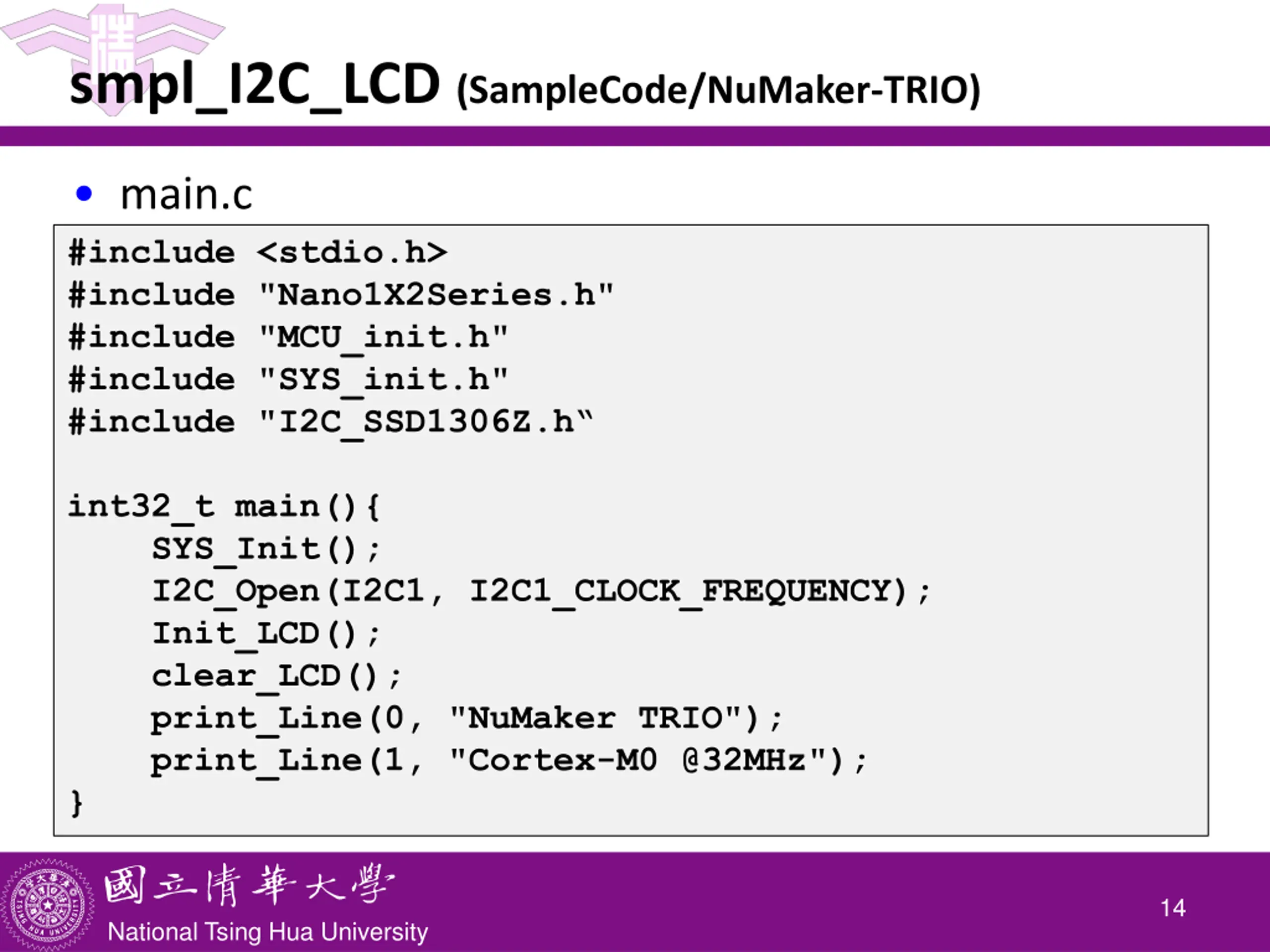 smpl_I2C_LCD (SampleCode/NuMaker-TRIO) main.c #include <stdio.h> #include "Nano1X2Series.h" #include "MCU_init.h" #include "SYS_init.h" #include "I2C_SSD1306Z.h int32_t main(){ SYS_Init(); I2C_Open(I2C1, I2C1_CLOCK_FREQUENCY); Init_LCD(); clear_LCD(); print_Line(0, "NuMaker TRIO"); print_Line(1, "Cortex-M0 @32MHz"); } 14 National Tsing Hua University