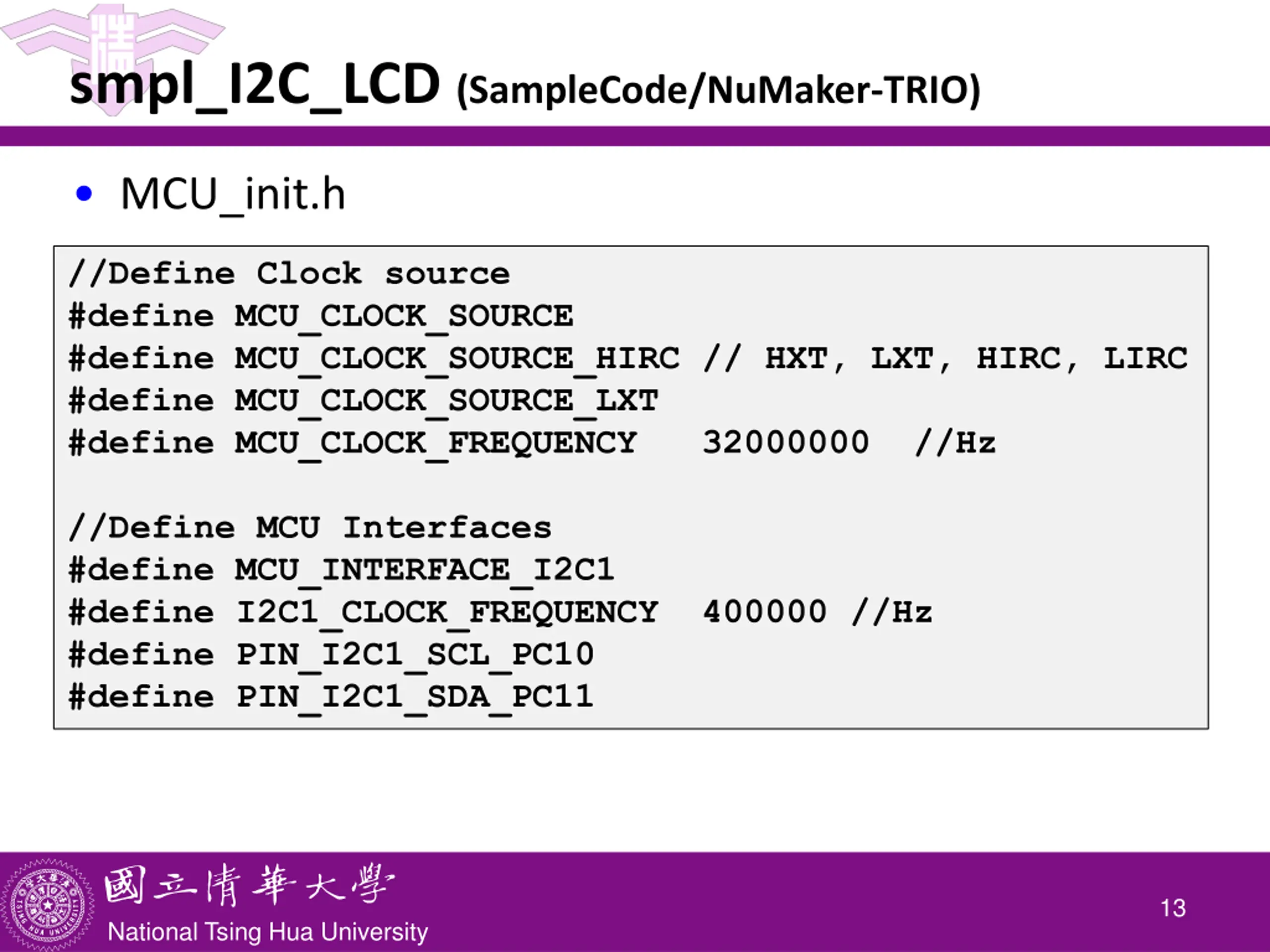 smpl_I2C_LCD (SampleCode/NuMaker-TRIO) MCU_init.h //Define Clock source #define MCU_CLOCK_SOURCE #define MCU_CLOCK_SOURCE_HIRC // HXT, LXT, HIRC, LIRC #define MCU_CLOCK_SOURCE_LXT #define MCU_CLOCK_FREQUENCY 32000000 //Hz //Define MCU Interfaces #define MCU_INTERFACE_I2C1 #define I2C1_CLOCK_FREQUENCY 400000 //Hz #define PIN_I2C1_SCL_PC10 #define PIN_I2C1_SDA_PC11 13 National Tsing Hua University
