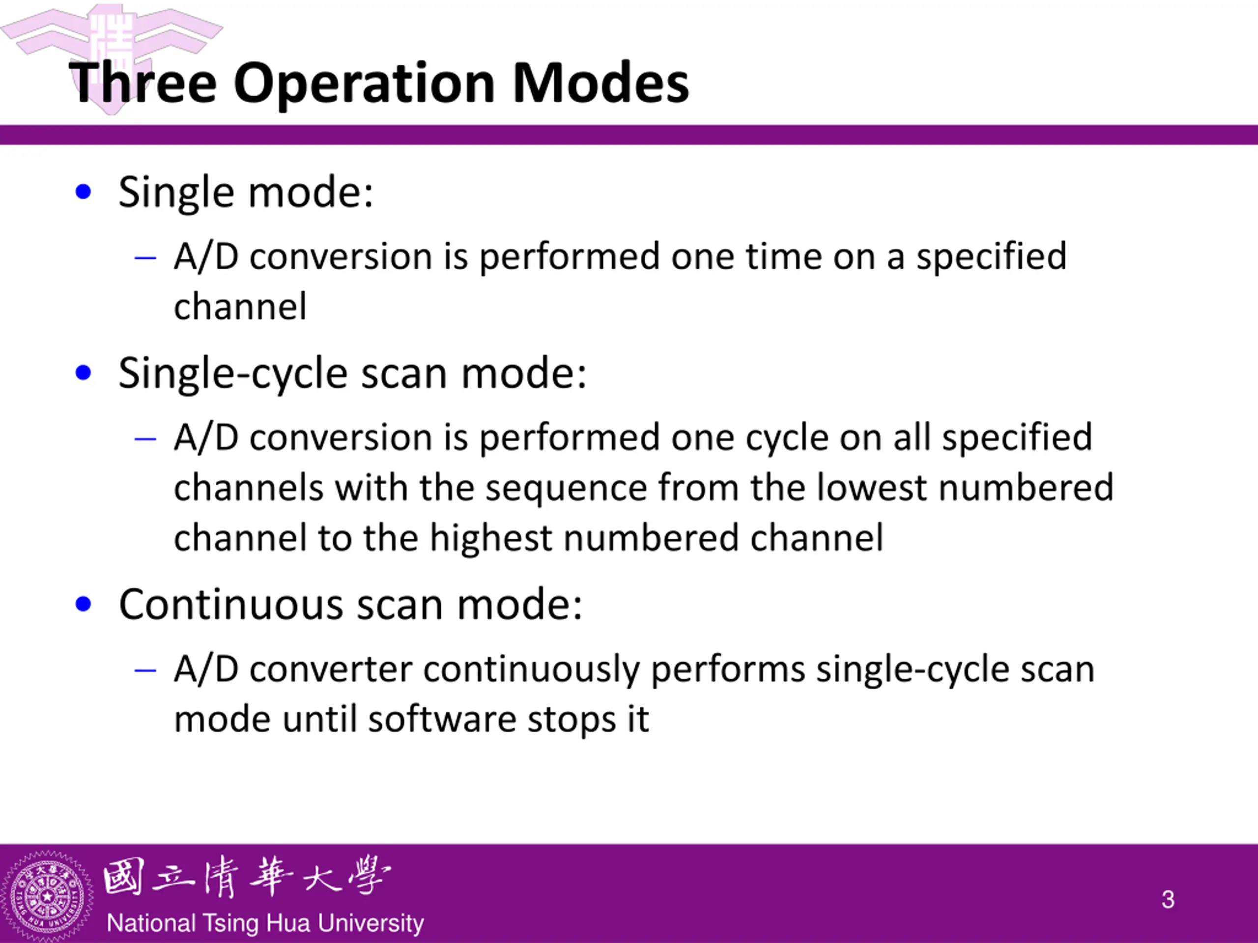 Three Operation Modes Single mode: A/D conversion is performed one time on a specified channel Single-cycle scan mode: A/D conversion is performed one cycle on all specified channels with the sequence from the lowest numbered channel to the highest numbered channel Continuous scan mode: A/D converter continuously performs single-cycle scan mode until software stops it 3 National Tsing Hua University