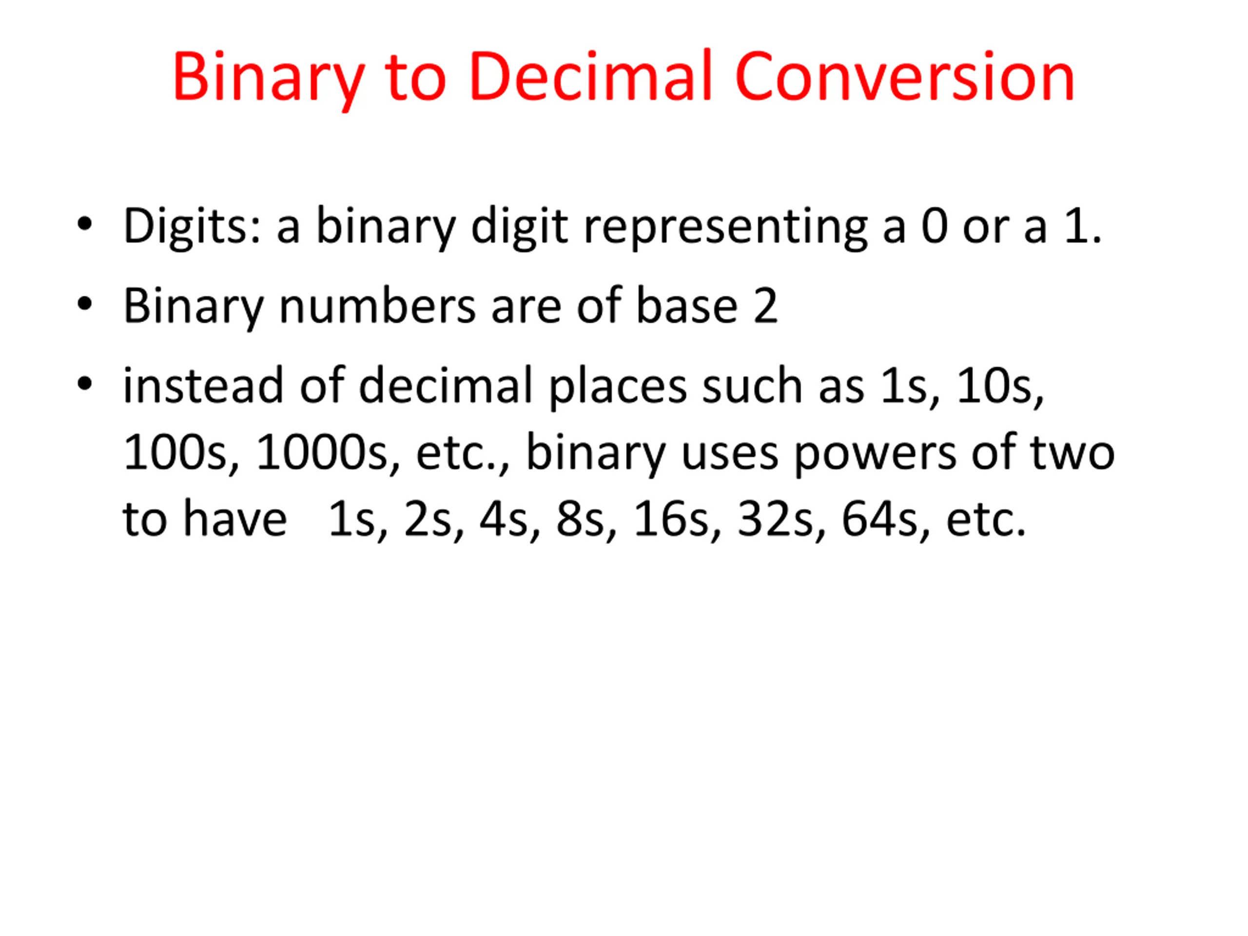 Binary to Decimal Conversion Digits: a binary digit representing a 0 or a 1. Binary numbers are of base 2 instead of decimal places such as 1s, 10s, 100s, 1000s, etc., binary uses powers of two to have 1s, 2s, 4s, 8s, 16s, 32s, 64s, etc.