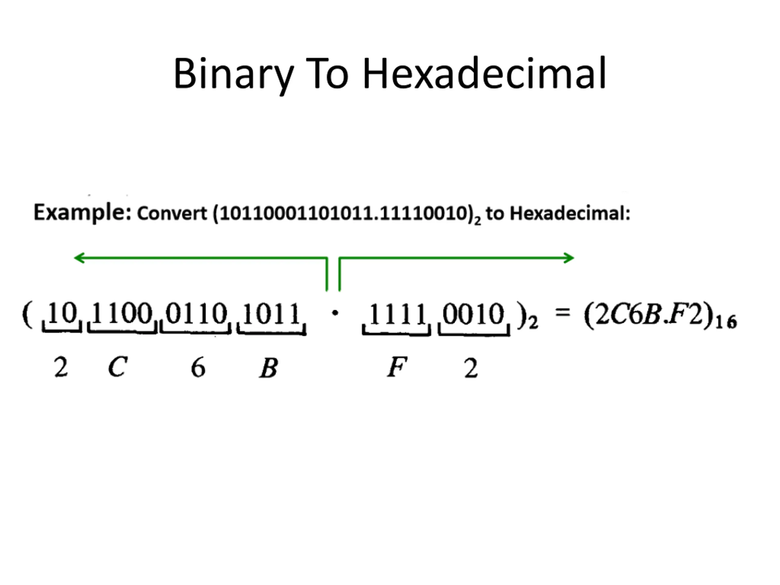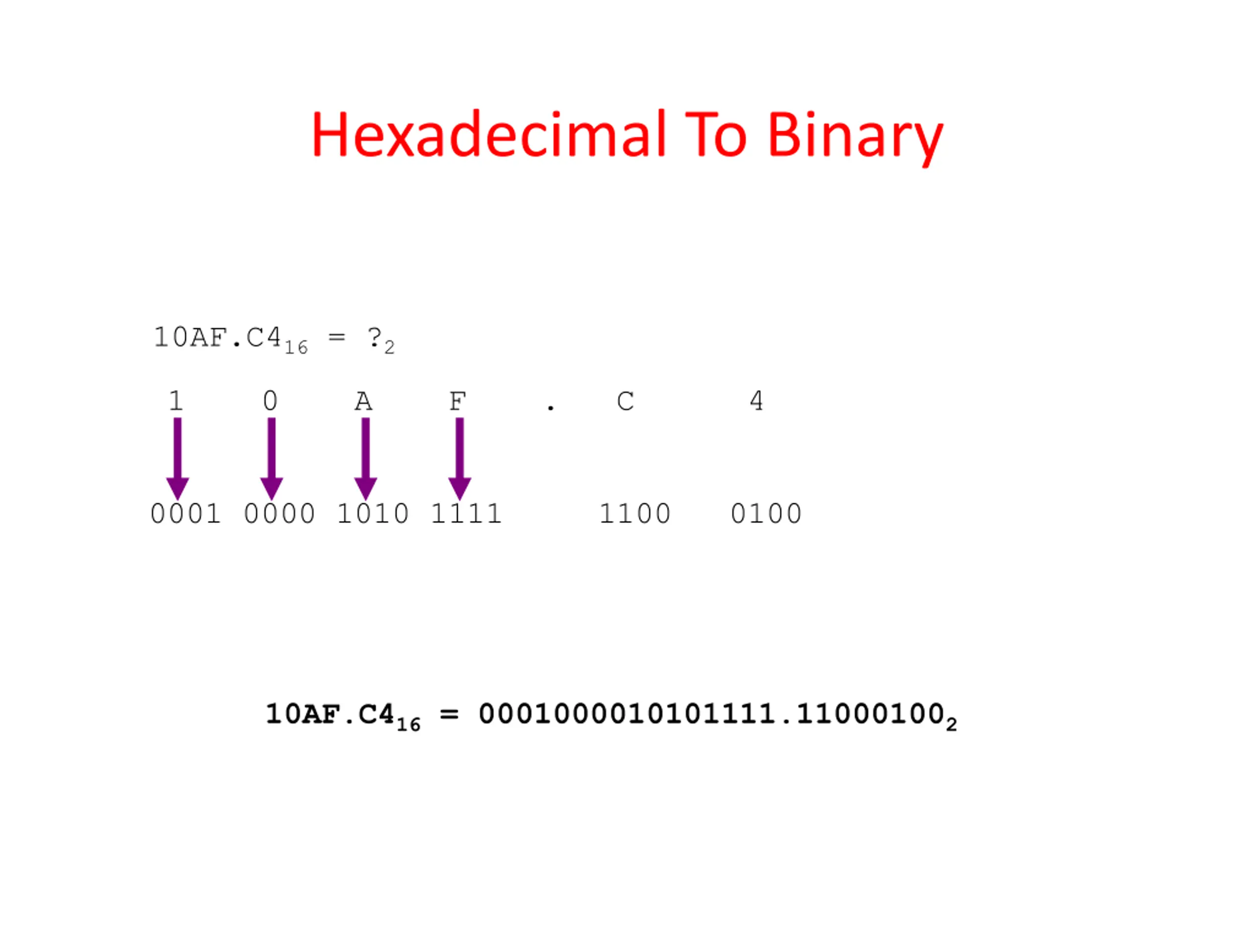 Hexadecimal To Binary 10AF.C416 = ?2 1 0 A F . C 4 0001 0000 1010 1111 1100 0100 10AF.C416 = 0001000010101111.110001002