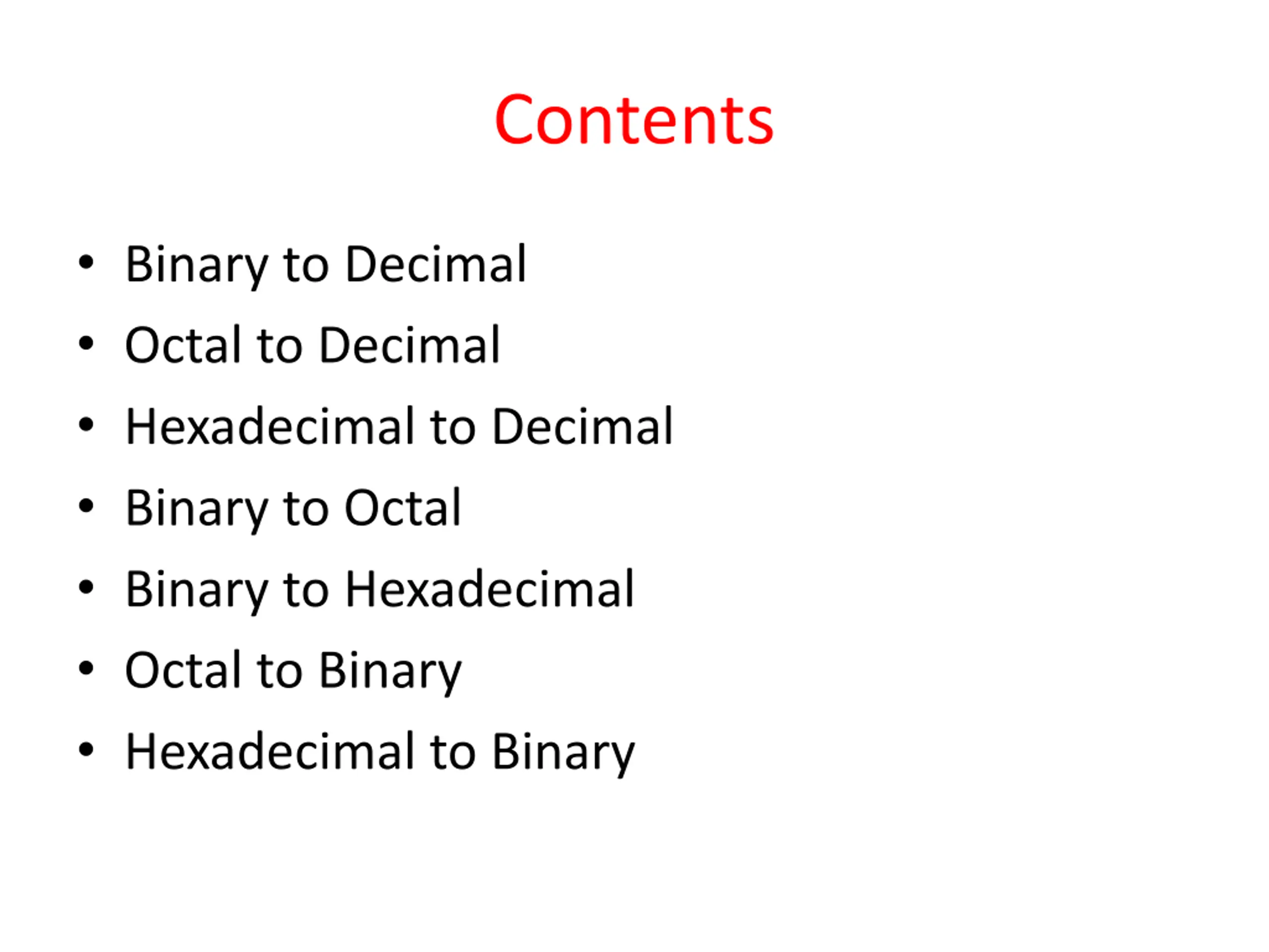 Contents Binary to Decimal Octal to Decimal Hexadecimal to Decimal Binary to Octal Binary to Hexadecimal Octal to Binary Hexadecimal to Binary
