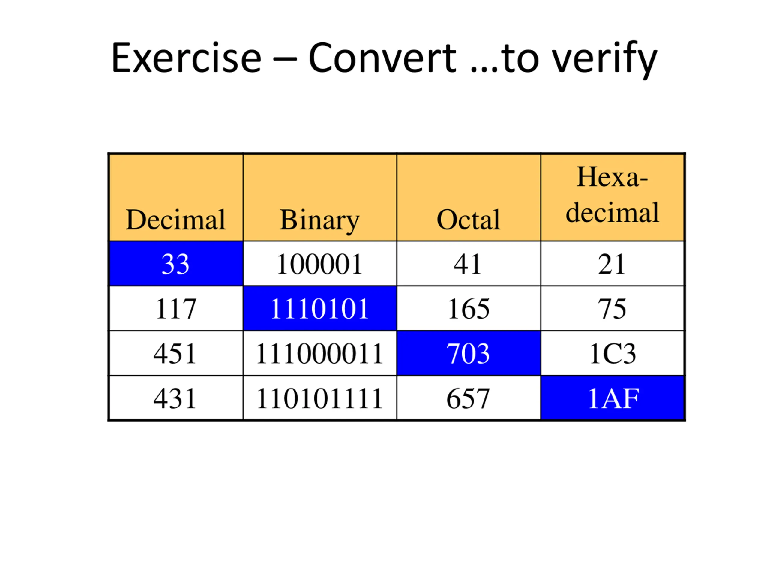 Exercise Convert to verify Hexa- decimal Decimal 33 117 451 431 Binary 100001 1110101 111000011 110101111 Octal 41 165 703 657 21 75 1C3 1AF