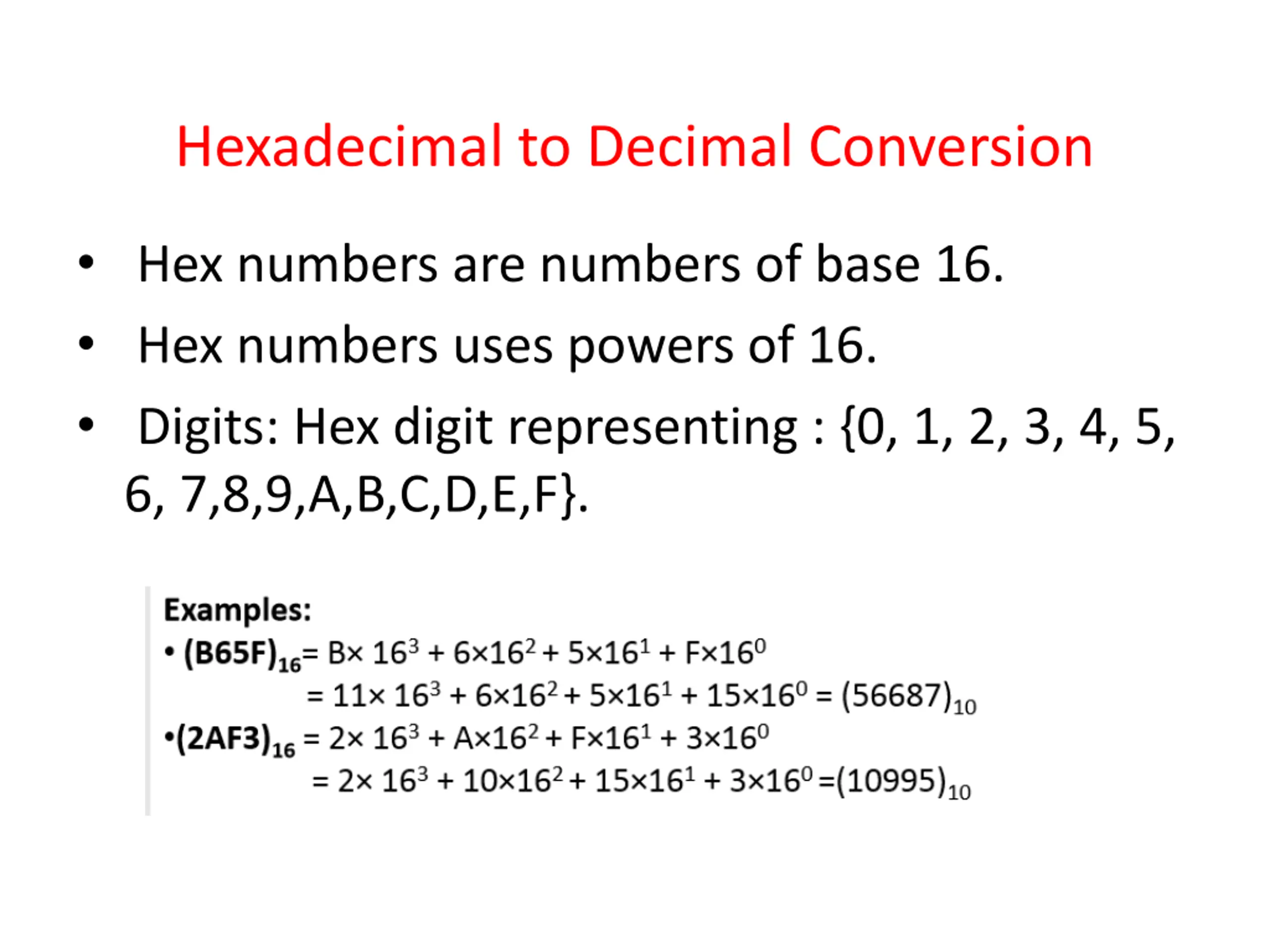 Hexadecimal to Decimal Conversion Hex numbers are numbers of base 16. Hex numbers uses powers of 16. Digits: Hex digit representing : {0, 1, 2, 3, 4, 5, 6, 7,8,9,A,B,C,D,E,F}.