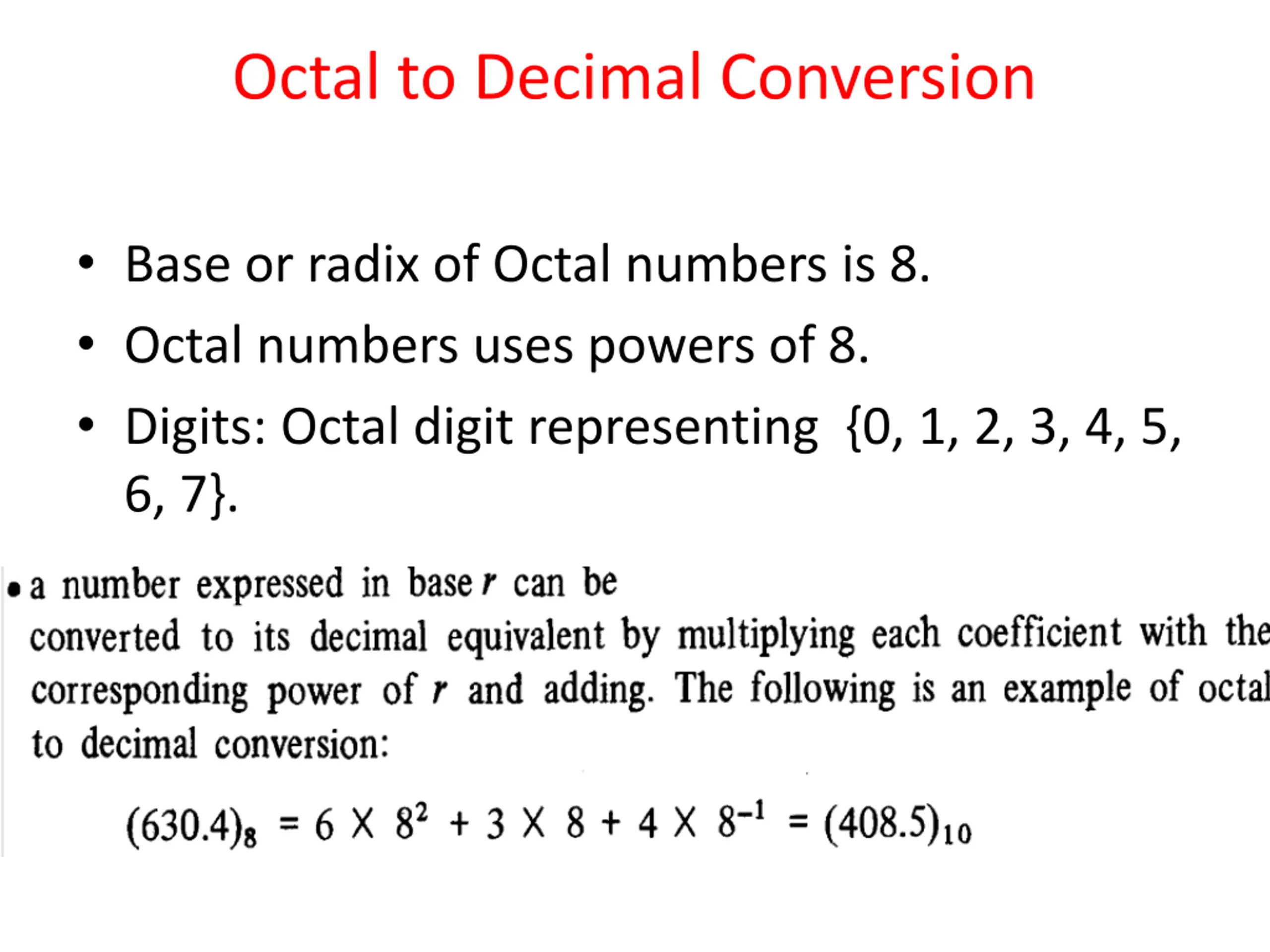 Octal to Decimal Conversion Base or radix of Octal numbers is 8. Octal numbers uses powers of 8. Digits: Octal digit representing {0, 1, 2, 3, 4, 5, 6, 7}.