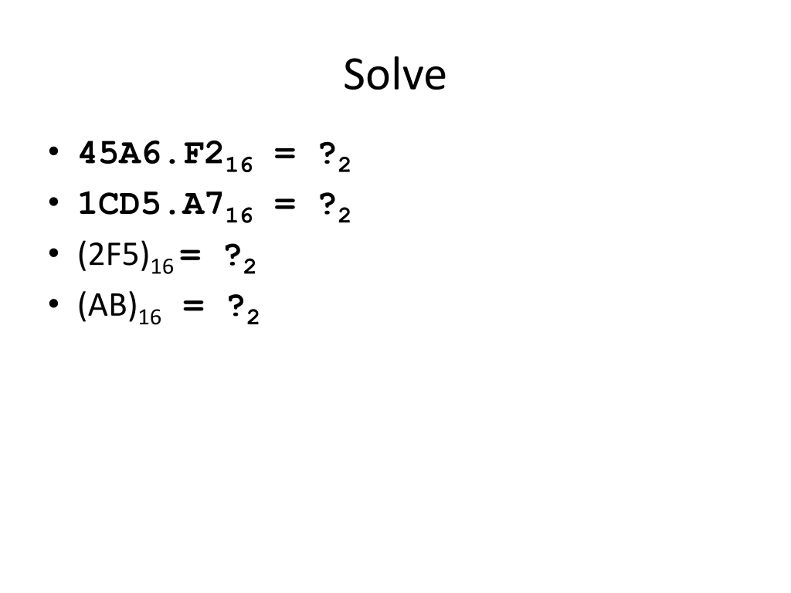 Solve 45A6.F216 = ?2 1CD5.A716 = ?2 (2F5)16 = ?2 (AB)16 = ?2