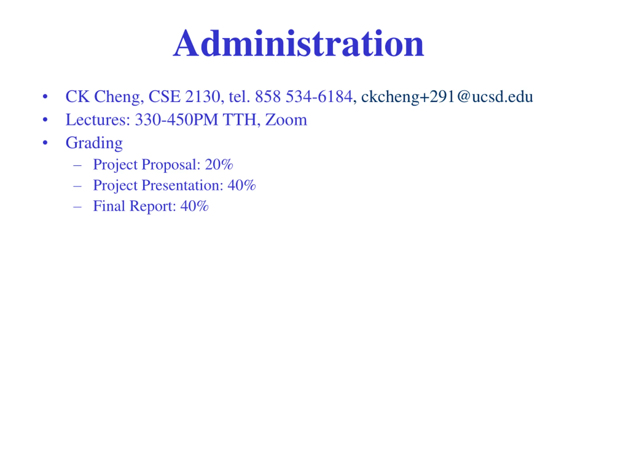 Administration CK Cheng, CSE 2130, tel. 858 534-6184, ckcheng+291@ucsd.edu Lectures: 330-450PM TTH, Zoom Grading Project Proposal: 20% Project Presentation: 40% Final Report: 40%