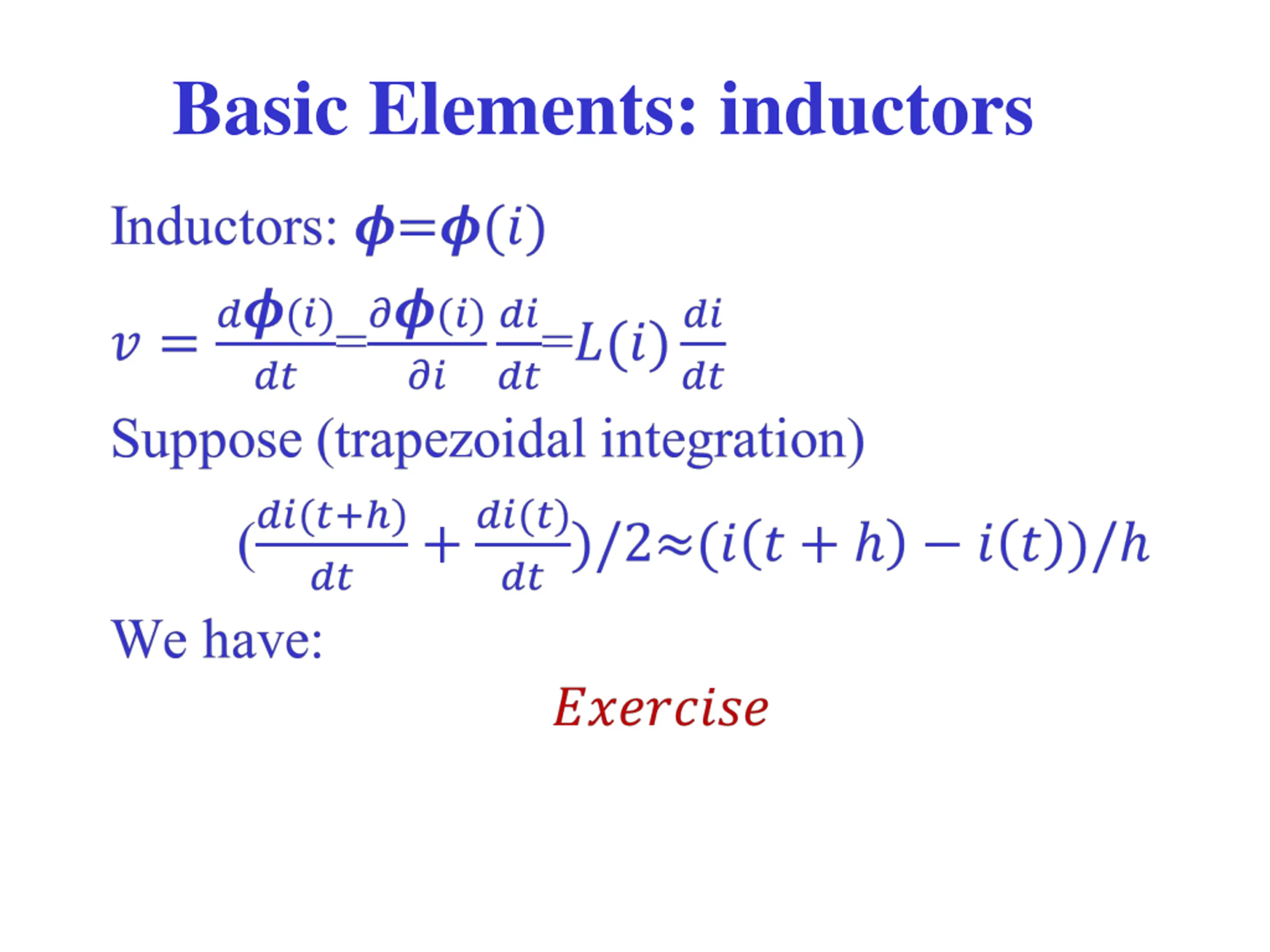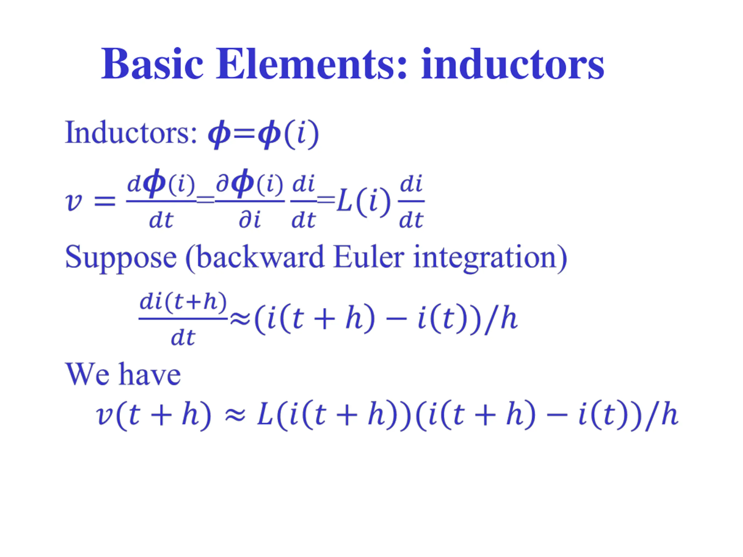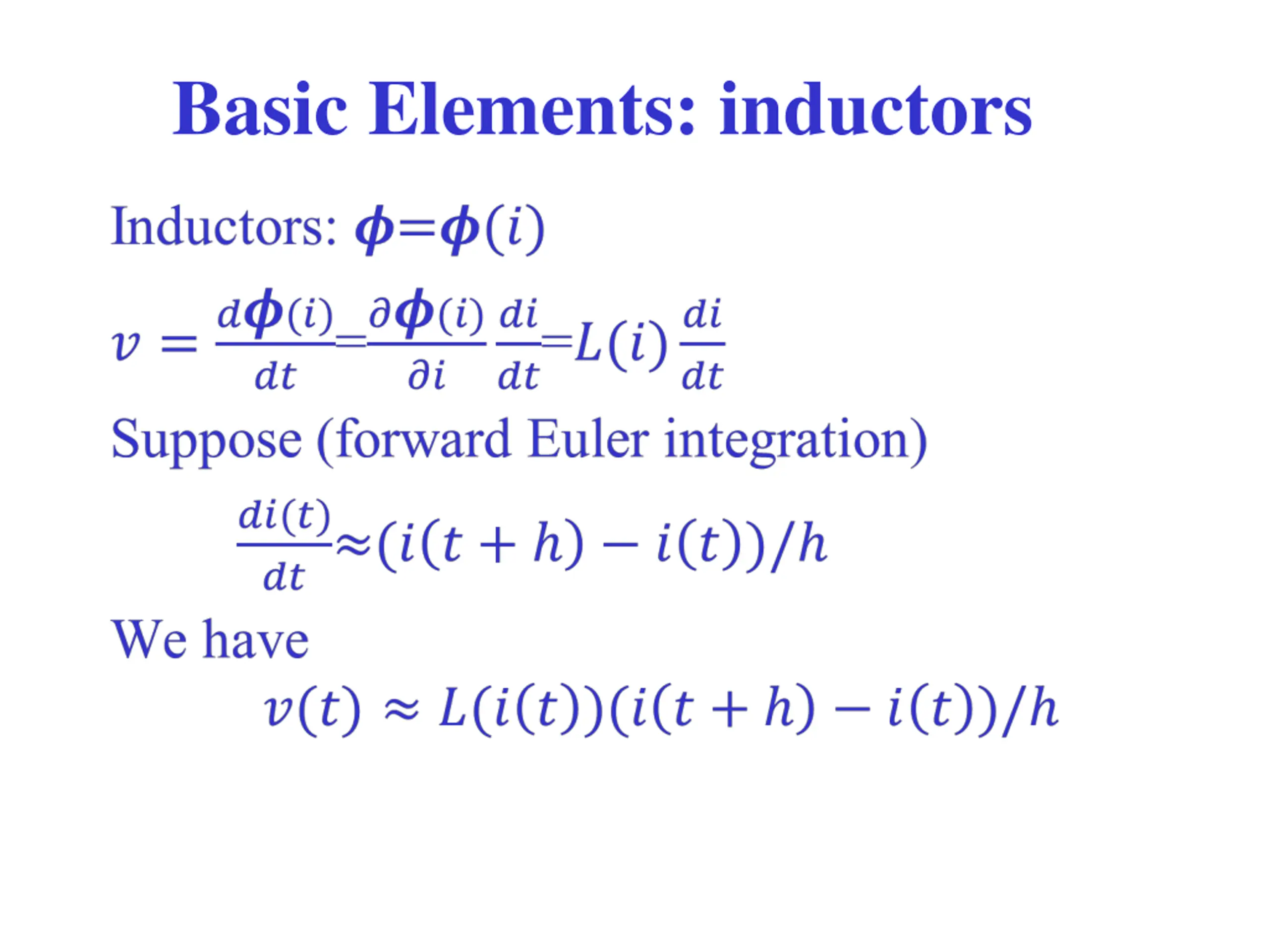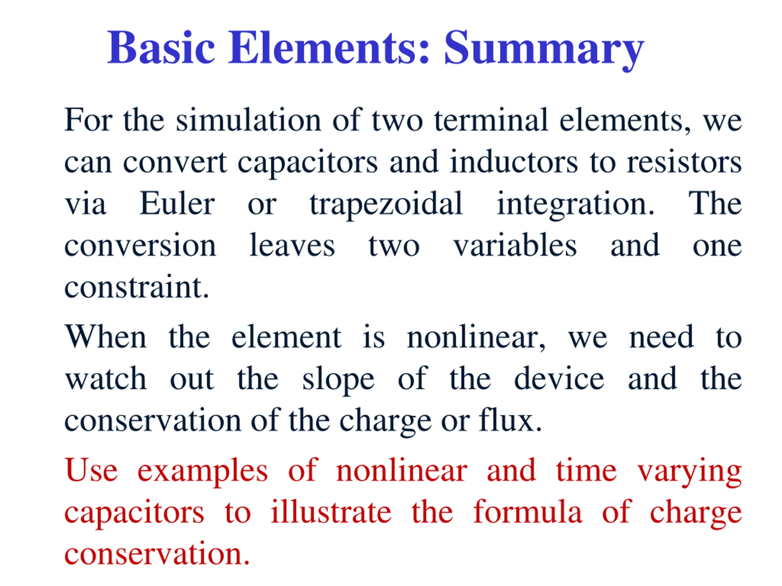 Basic Elements: Summary For the simulation of two terminal elements, we can convert capacitors and inductors to resistors via Euler or trapezoidal integration. The conversion leaves two variables and one constraint. When the element is nonlinear, we need to watch out the slope of the device and the conservation of the charge or flux. Use examples of nonlinear and time varying capacitors to illustrate the formula of charge conservation.
