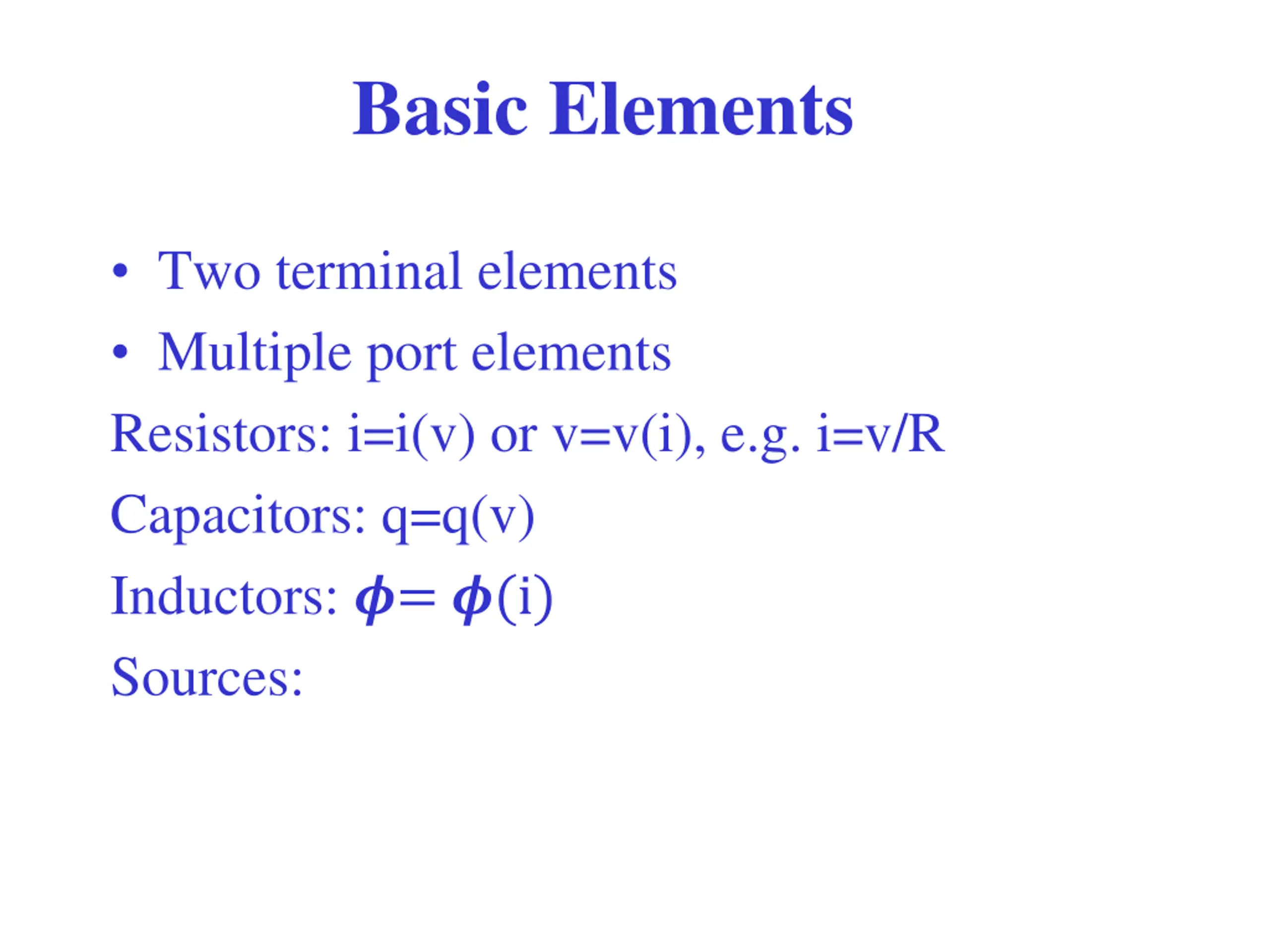 Basic Elements Two terminal elements Multiple port elements Resistors: i=i(v) or v=v(i), e.g. i=v/R Capacitors: q=q(v) Inductors: ?= ?(i) Sources:
