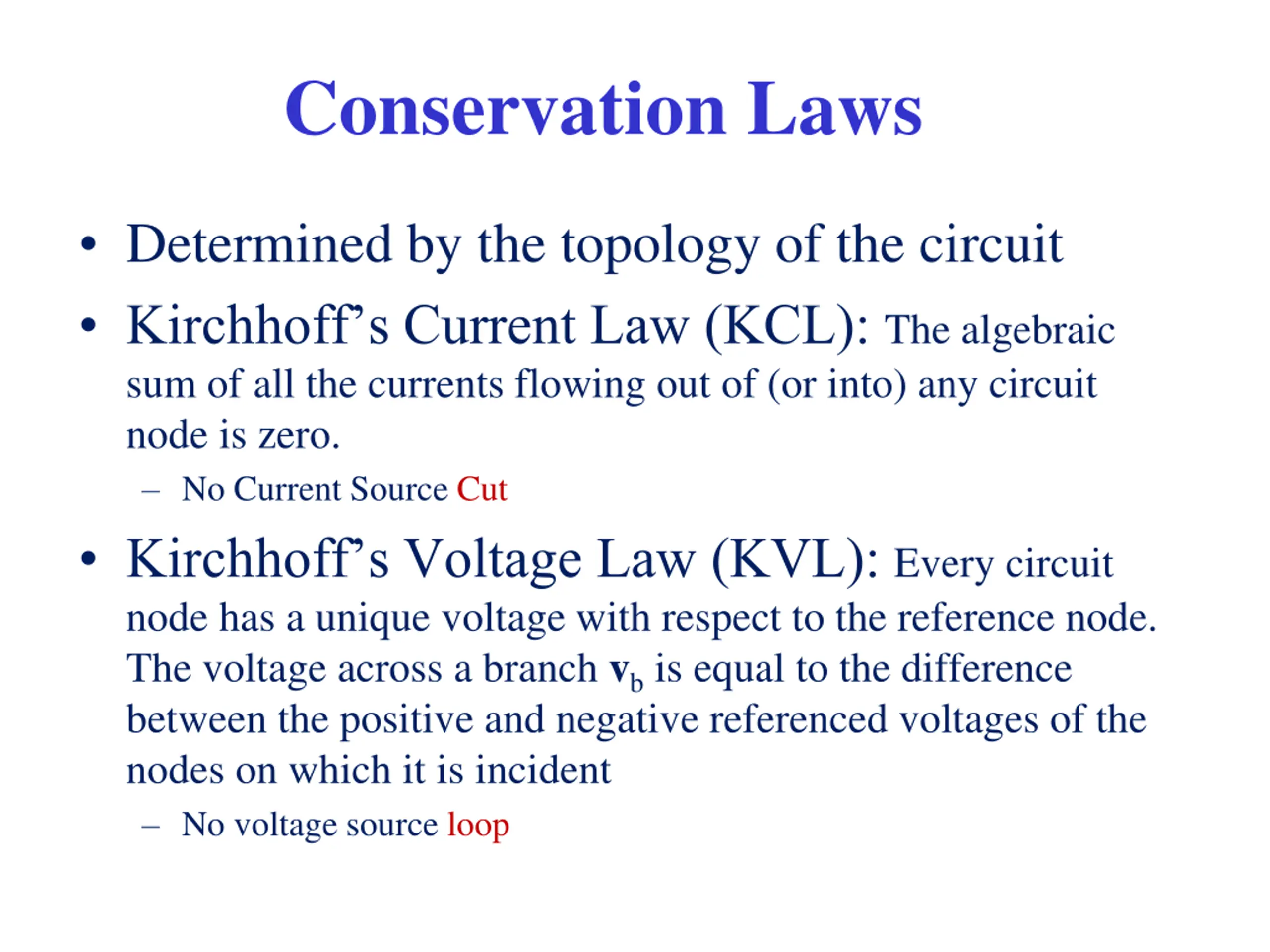 Conservation Laws Determined by the topology of the circuit Kirchhoff s Current Law (KCL): The algebraic sum of all the currents flowing out of (or into) any circuit node is zero. No Current Source Cut Kirchhoff s Voltage Law (KVL): Every circuit node has a unique voltage with respect to the reference node. The voltage across a branch vb is equal to the difference between the positive and negative referenced voltages of the nodes on which it is incident No voltage source loop