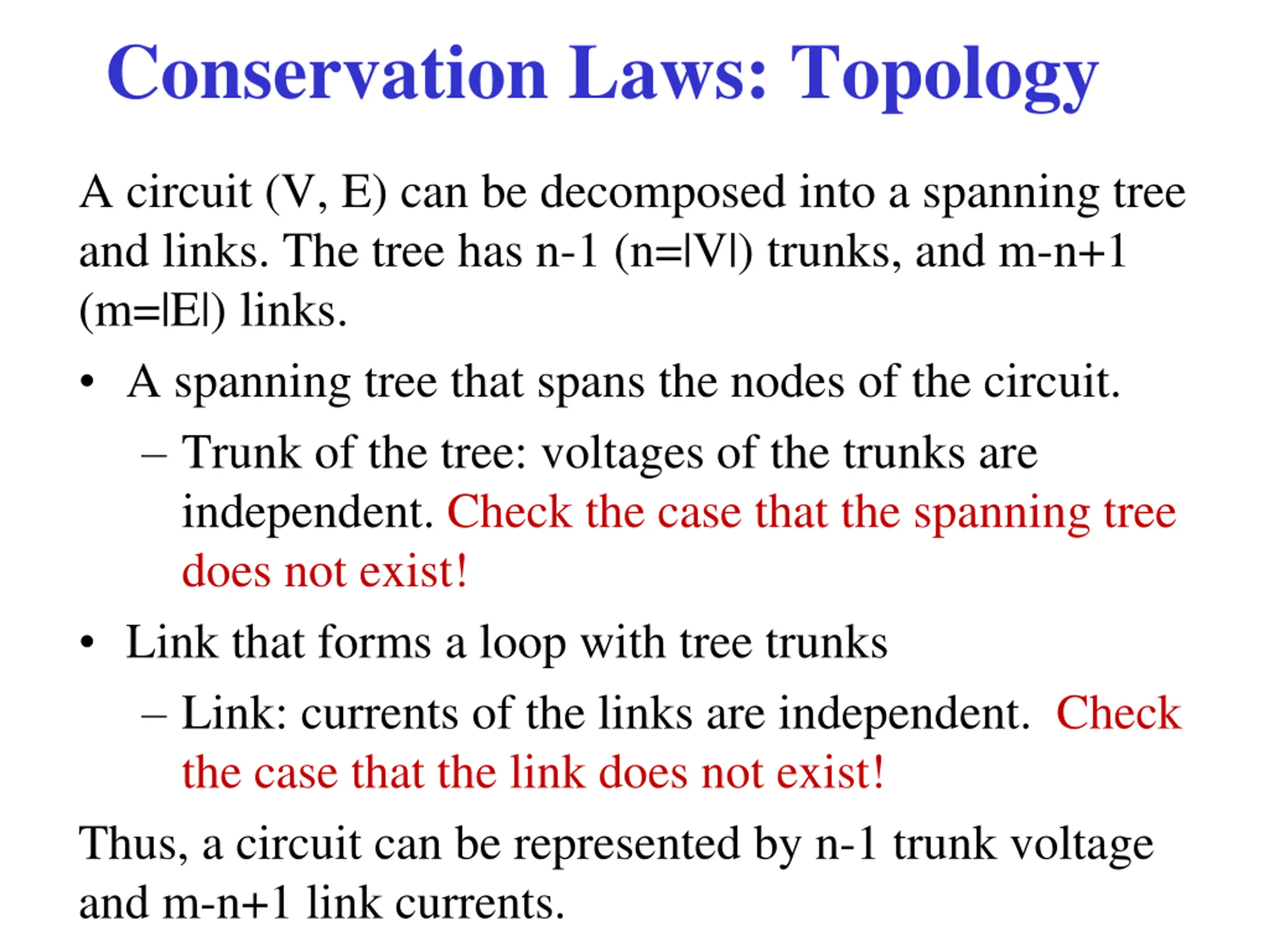 Conservation Laws: Topology A circuit (V, E) can be decomposed into a spanning tree and links. The tree has n-1 (n=|V|) trunks, and m-n+1 (m=|E|) links. A spanning tree that spans the nodes of the circuit. Trunk of the tree: voltages of the trunks are independent. Check the case that the spanning tree does not exist! Link that forms a loop with tree trunks Link: currents of the links are independent. Check the case that the link does not exist! Thus, a circuit can be represented by n-1 trunk voltage and m-n+1 link currents.