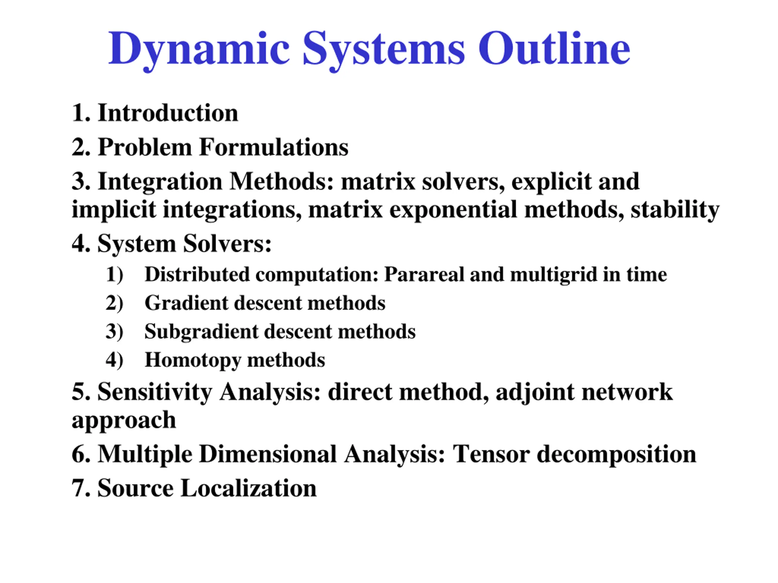 Dynamic Systems Outline 1. Introduction 2. Problem Formulations 3. Integration Methods: matrix solvers, explicit and implicit integrations, matrix exponential methods, stability 4. System Solvers: 1) Distributed computation: Parareal and multigrid in time 2) Gradient descent methods 3) Subgradient descent methods 4) Homotopy methods 5. Sensitivity Analysis: direct method, adjoint network approach 6. Multiple Dimensional Analysis: Tensor decomposition 7. Source Localization