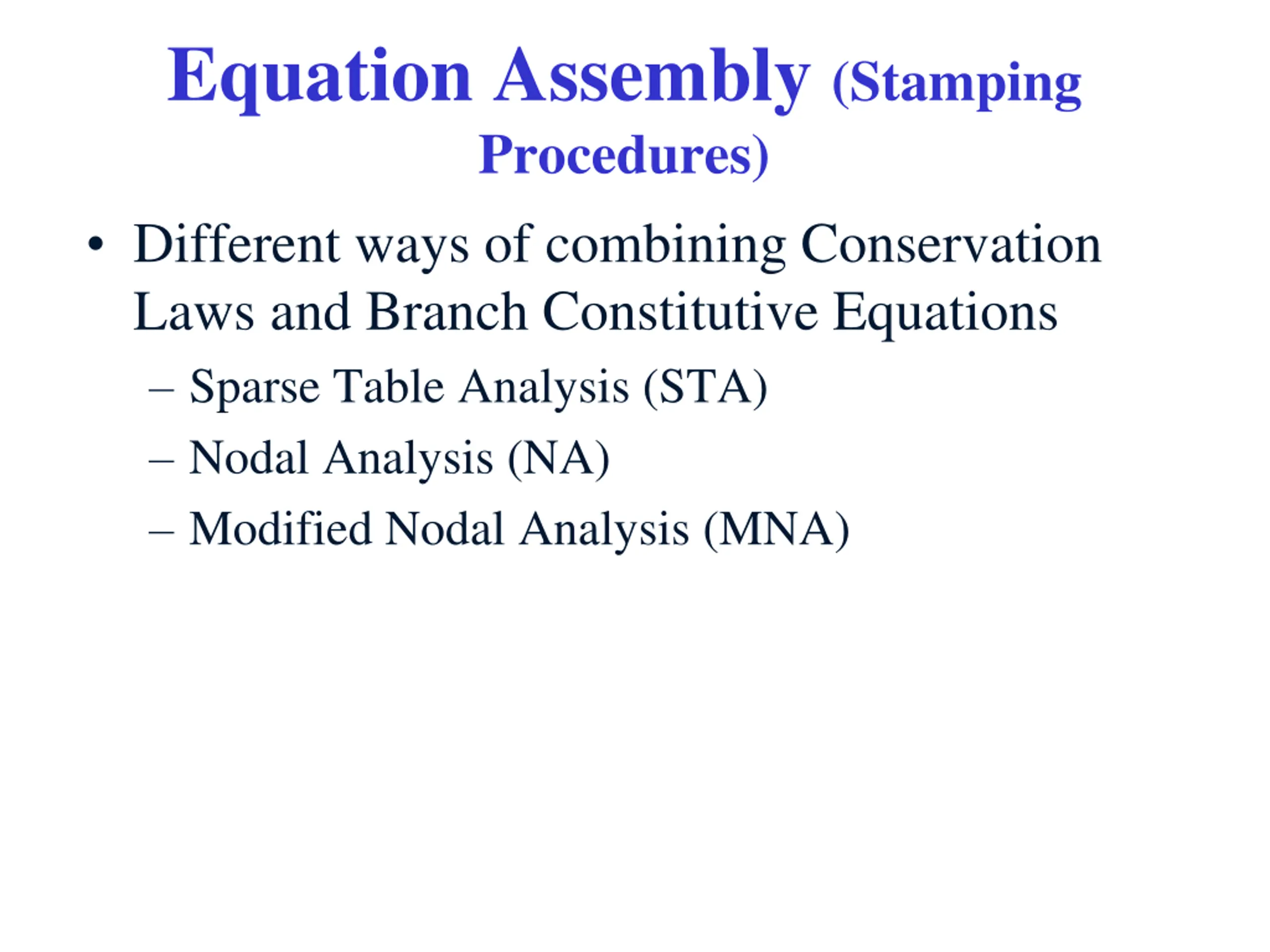 Equation Assembly (Stamping Procedures) Different ways of combining Conservation Laws and Branch Constitutive Equations Sparse Table Analysis (STA) Nodal Analysis (NA) Modified Nodal Analysis (MNA)