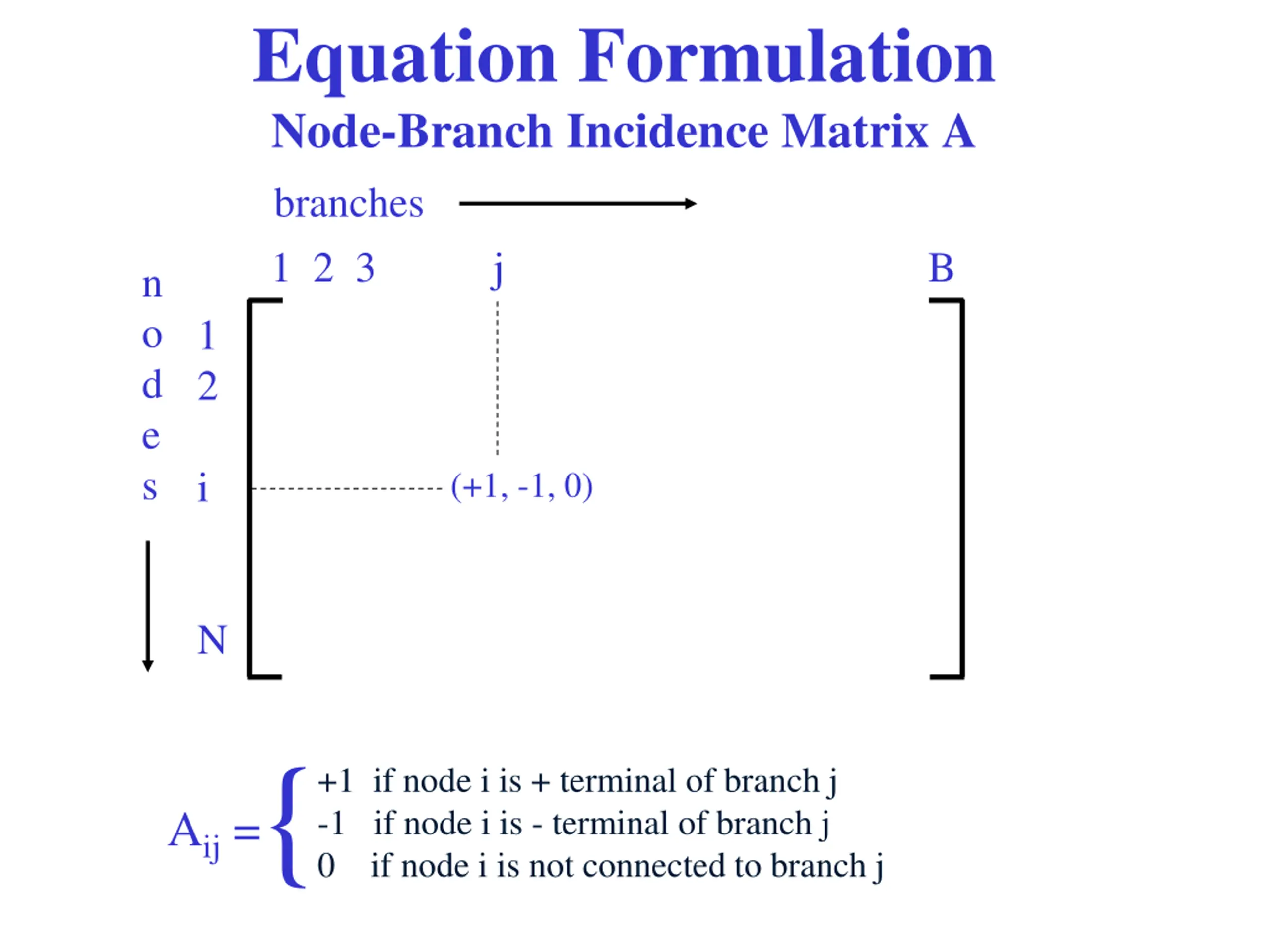 Equation Formulation Node-Branch Incidence Matrix A branches 1 2 3 j B n o d e s 1 2 i (+1, -1, 0) N { +1 if node i is + terminal of branch j -1 if node i is - terminal of branch j 0 if node i is not connected to branch j Aij =