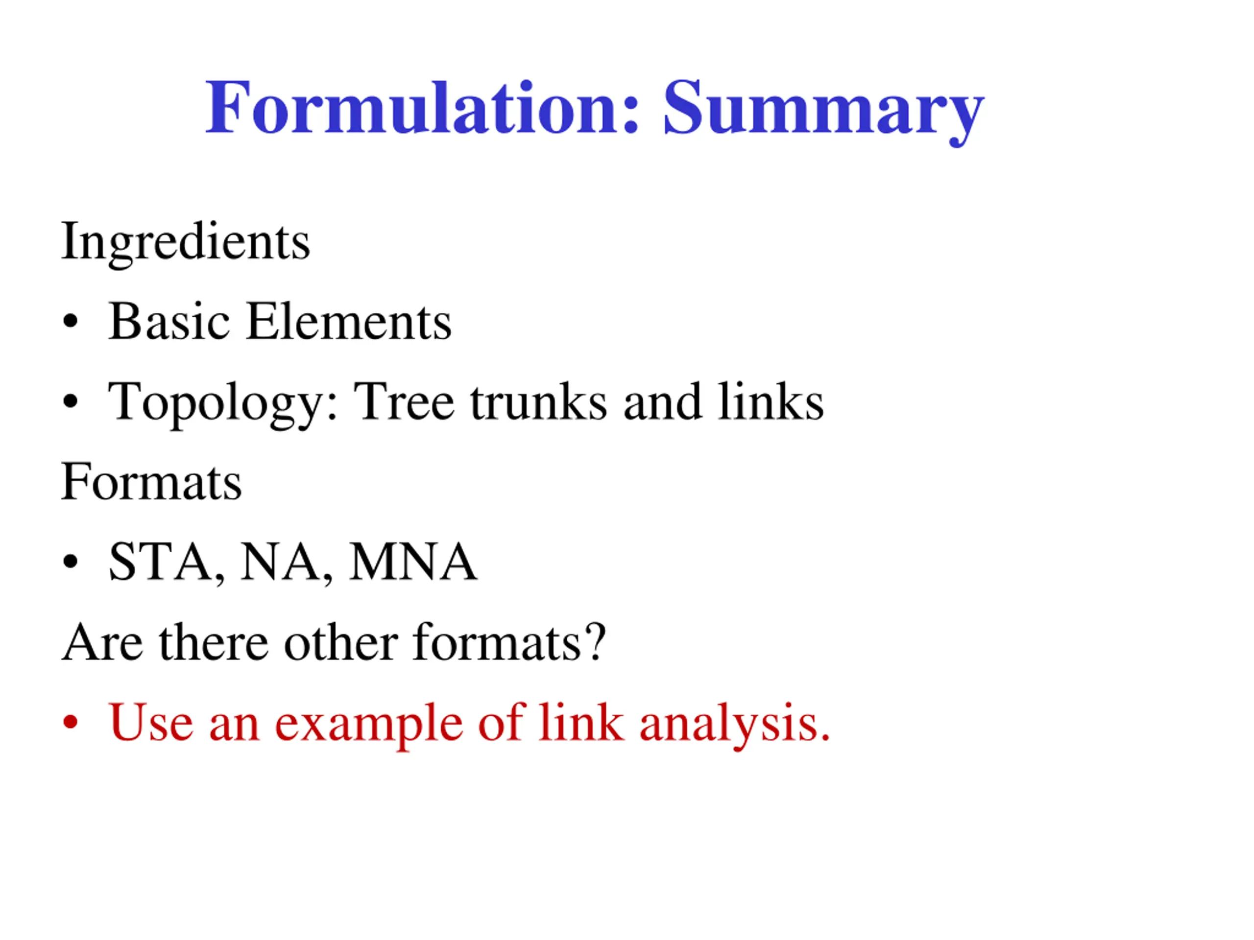Formulation: Summary Ingredients Basic Elements Topology: Tree trunks and links Formats STA, NA, MNA Are there other formats? Use an example of link analysis.