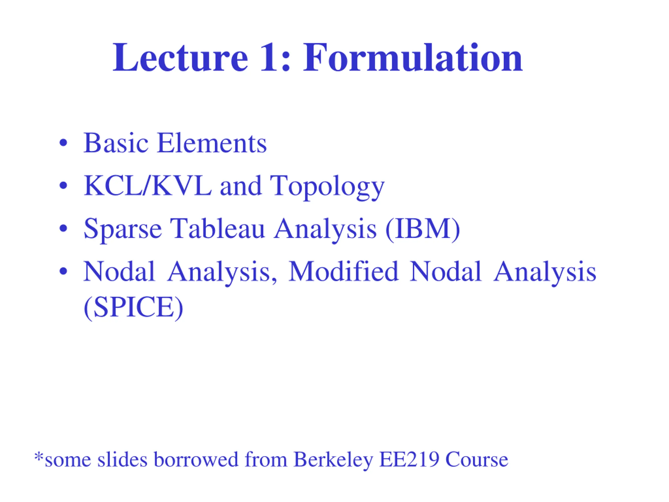 Lecture 1: Formulation Basic Elements KCL/KVL and Topology Sparse Tableau Analysis (IBM) Nodal Analysis, Modified Nodal Analysis (SPICE) *some slides borrowed from Berkeley EE219 Course
