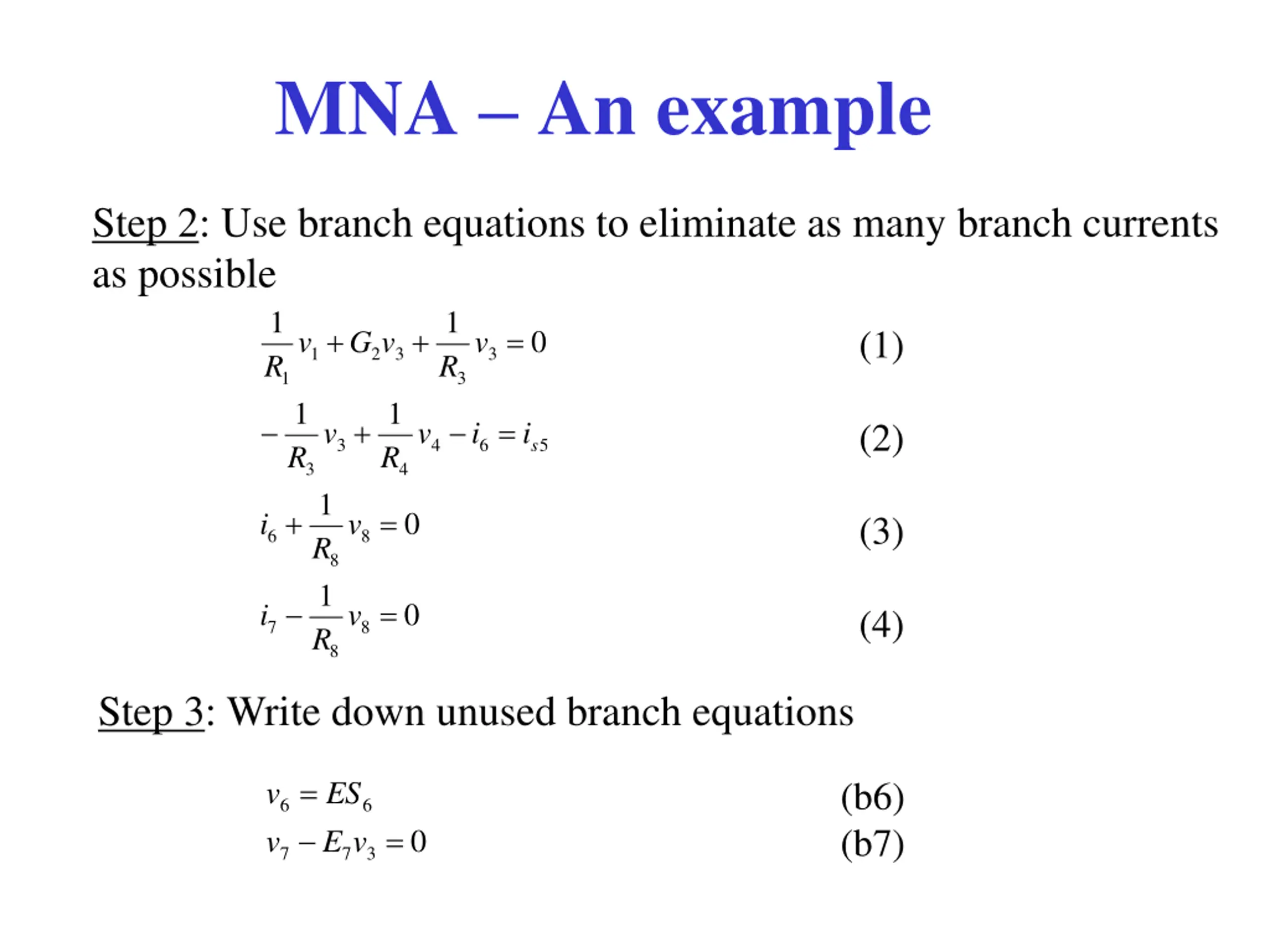 MNA An example Step 2: Use branch equations to eliminate as many branch currents as possible 1 1 3 3 1 R R + + = (1) 0 v G v v 1 2 3 1 R 1 R + = v v i i (2) 3 4 6 5 s 3 4 1 R + = 0 i v (3) 6 8 8 1 R = 0 i v (4) 7 8 8 Step 3: Write down unused branch equations = (b6) (b7) v ES 6 6 = 0 v E v 7 7 3