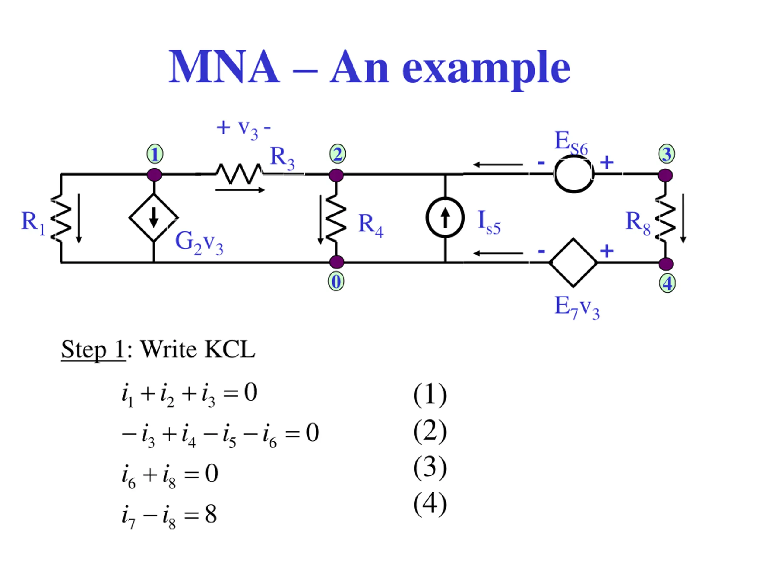 MNA An example + v3 - ES6 R3 2 3 1 - + Is5 R1 R8 R4 G2v3 - + 0 4 E7v3 Step 1: Write KCL + i + i = i (1) (2) (3) (4) 0 i i i 1 2 3 i + i = 0 i 3 4 = 5 6 + 0 6 8 = 8 i i 7 8