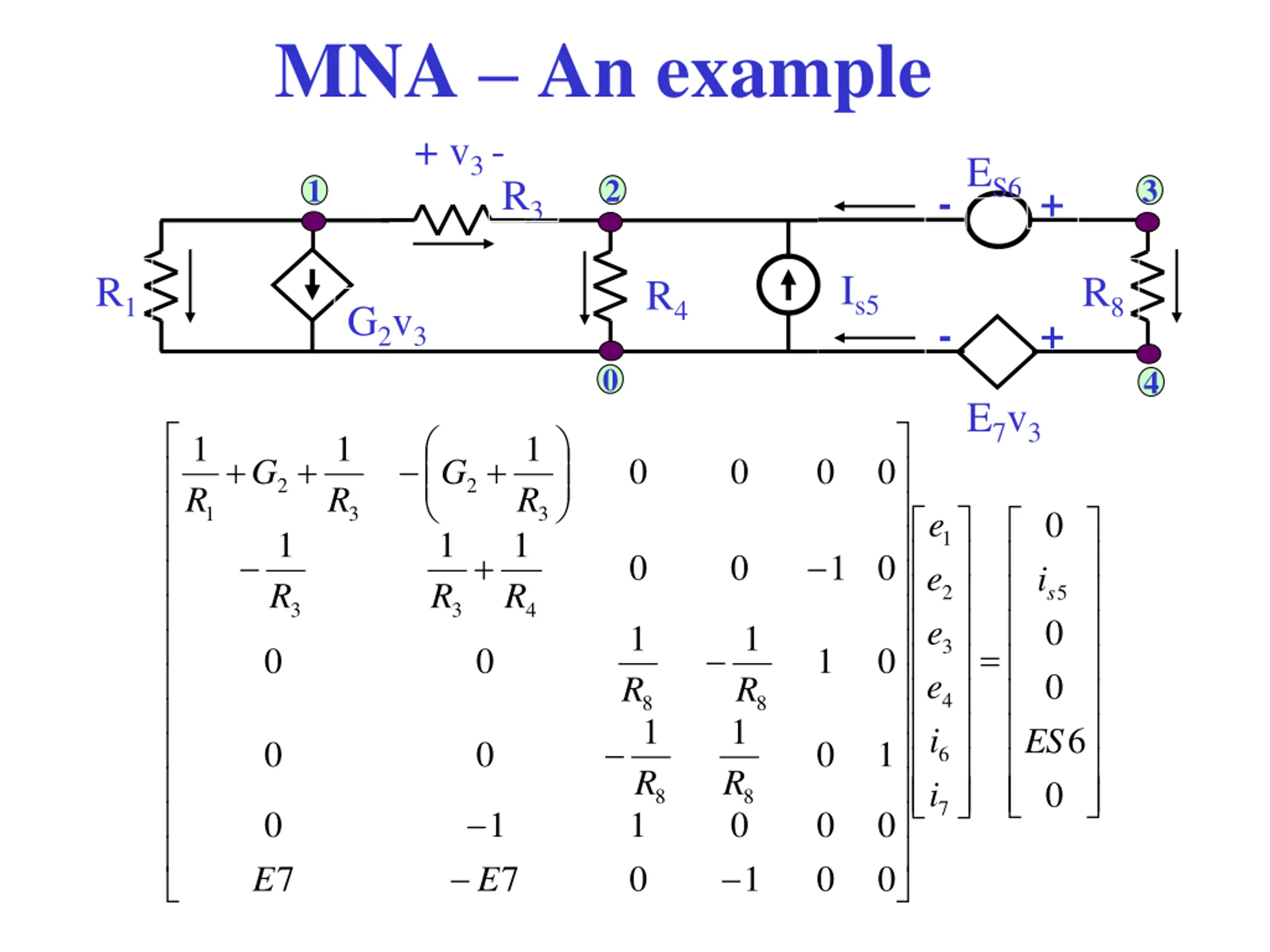 MNA An example Yn B 0 e = MS C i 1 R 1 R 1 R + + + 0 0 0 0 G G 2 2 1 3 3 0 i s e 1 R 1 R 1 R 1 + 0 0 1 0 e 2 5 3 3 4 0 e 1 R 1 R 3 = 0 0 1 0 0 e 4 8 8 1 R 1 R i 6 ES 0 0 0 1 6 0 i 8 8 7 0 1 1 0 0 0 7 7 0 1 0 0 E E