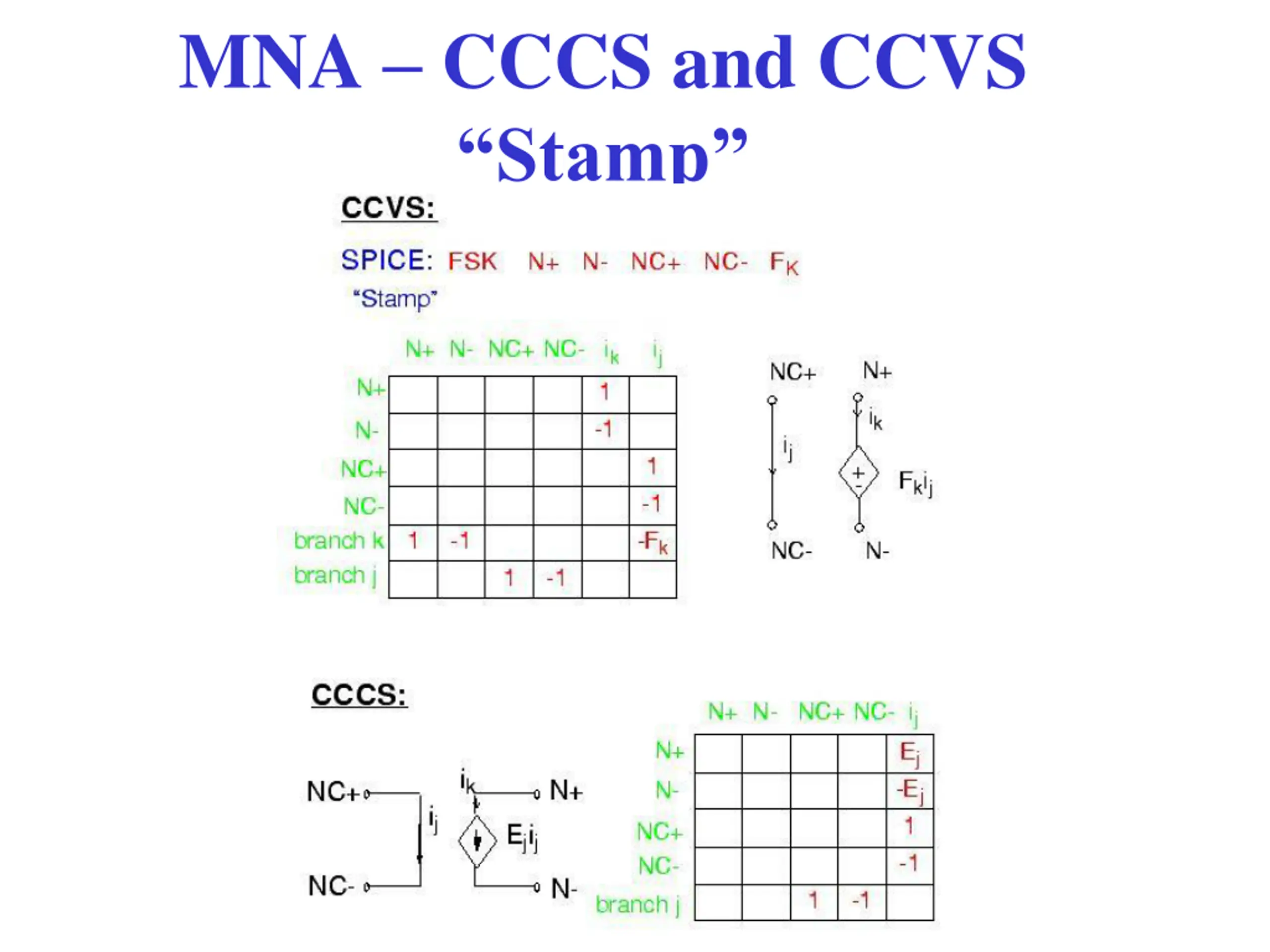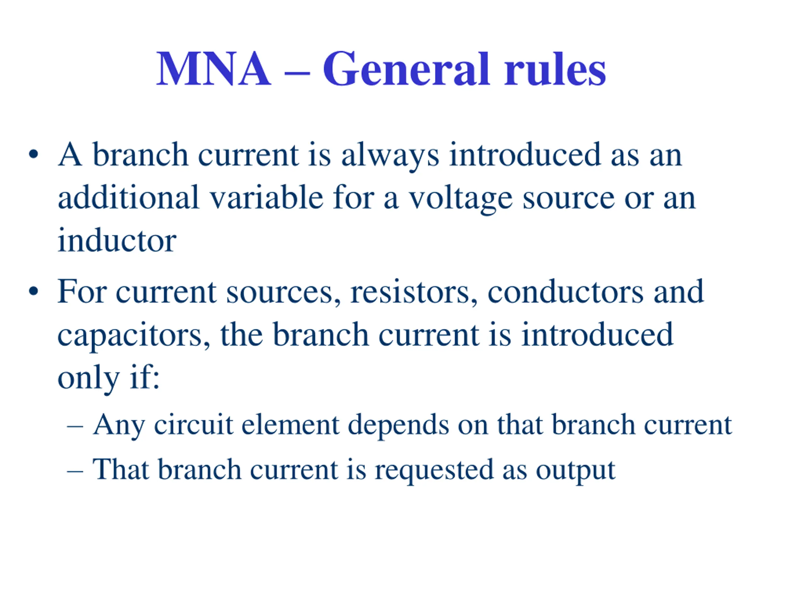 MNA General rules A branch current is always introduced as an additional variable for a voltage source or an inductor For current sources, resistors, conductors and capacitors, the branch current is introduced only if: Any circuit element depends on that branch current That branch current is requested as output