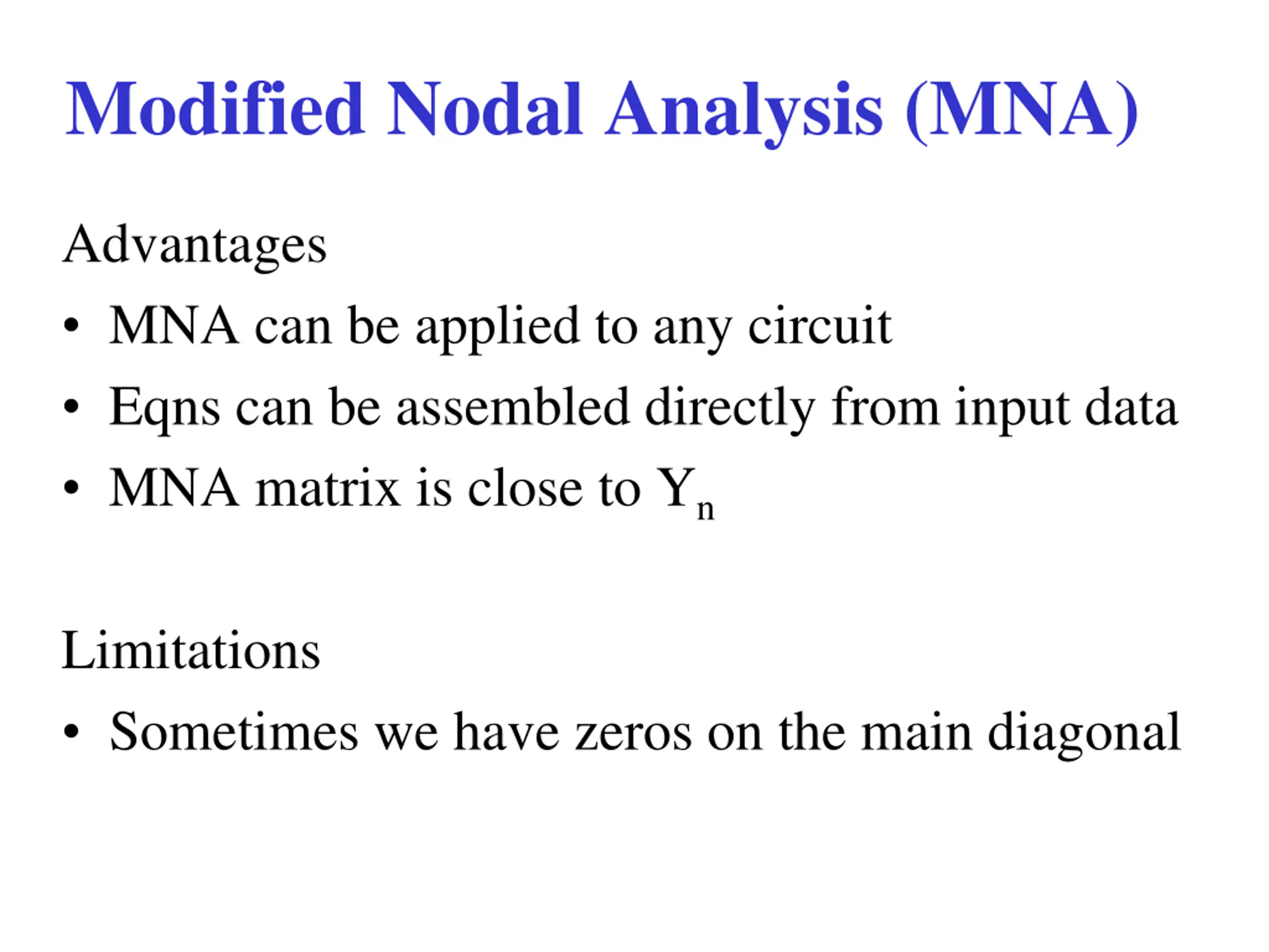 Modified Nodal Analysis (MNA) Advantages MNA can be applied to any circuit Eqns can be assembled directly from input data MNA matrix is close to Yn Limitations Sometimes we have zeros on the main diagonal