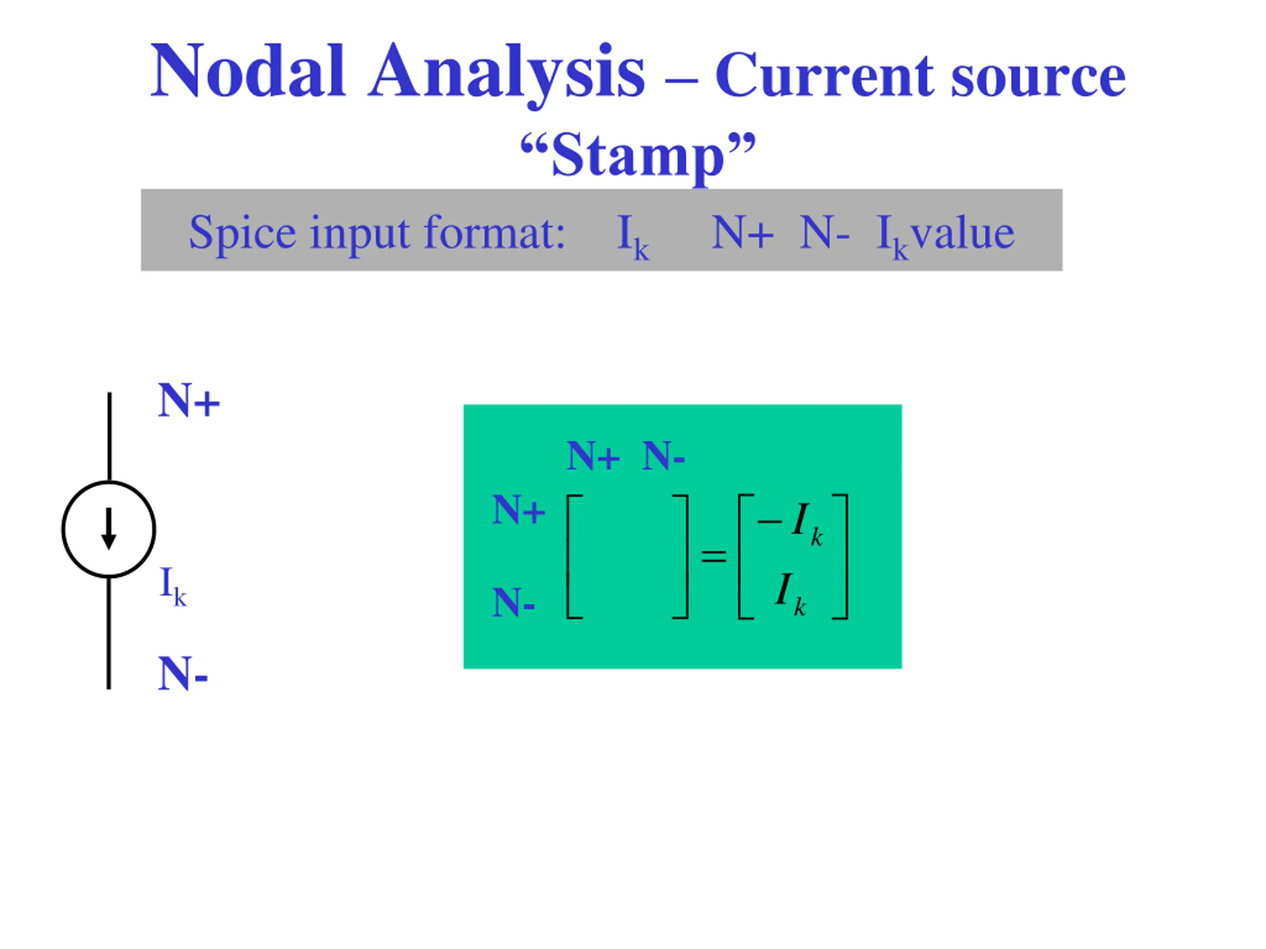 Nodal Analysis Current source Stamp Spice input format: Ik N+ N- Ikvalue N+ N+ N- N+ I k = Ik I N- k N-