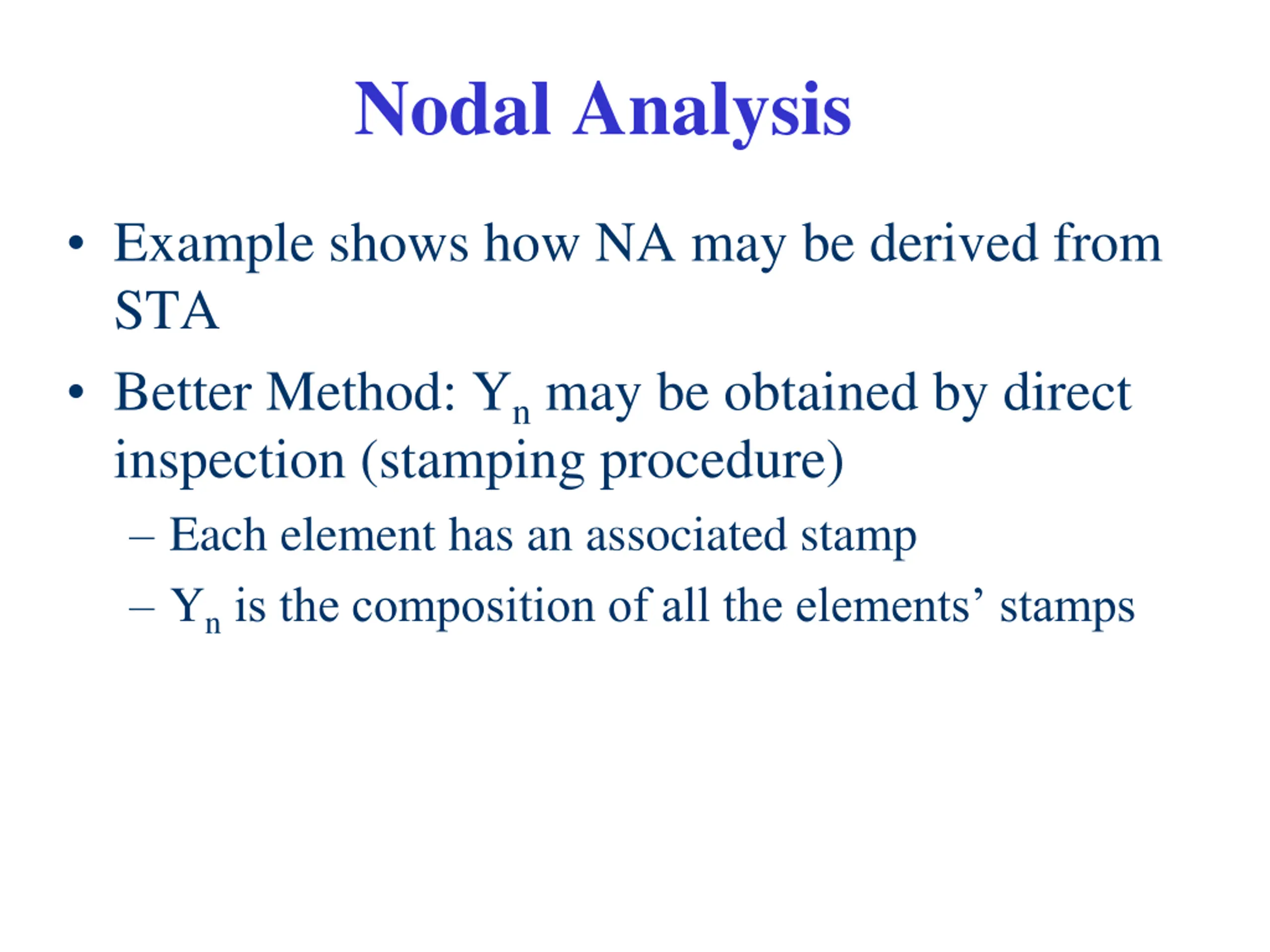 Nodal Analysis Example shows how NA may be derived from STA Better Method: Yn may be obtained by direct inspection (stamping procedure) Each element has an associated stamp Ynis the composition of all the elements stamps