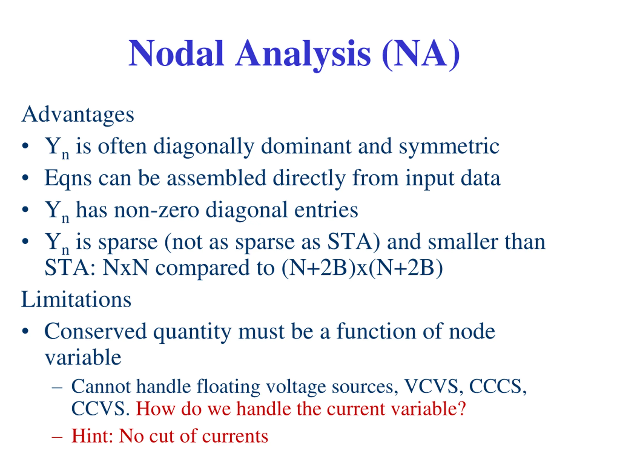 Nodal Analysis (NA) Advantages Yn is often diagonally dominant and symmetric Eqns can be assembled directly from input data Yn has non-zero diagonal entries Yn is sparse (not as sparse as STA) and smaller than STA: NxN compared to (N+2B)x(N+2B) Limitations Conserved quantity must be a function of node variable Cannot handle floating voltage sources, VCVS, CCCS, CCVS. How do we handle the current variable? Hint: No cut of currents