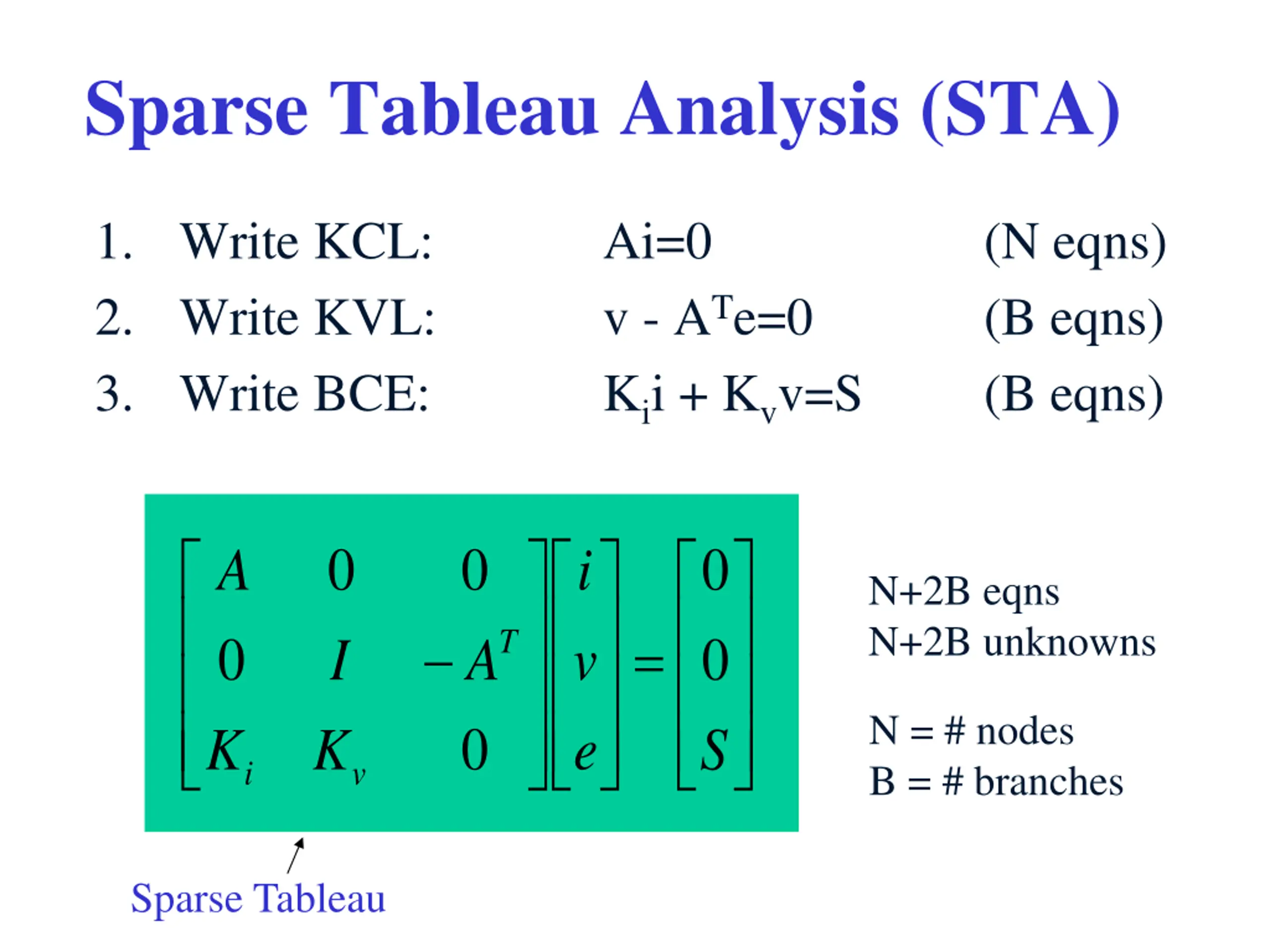 Sparse Tableau Analysis (STA) Advantages It can be applied to any circuit Eqns can be assembled directly from input data Coefficient Matrix is very sparse Disadvantages Sophisticated programming techniques and data structures are required for time and memory efficiency