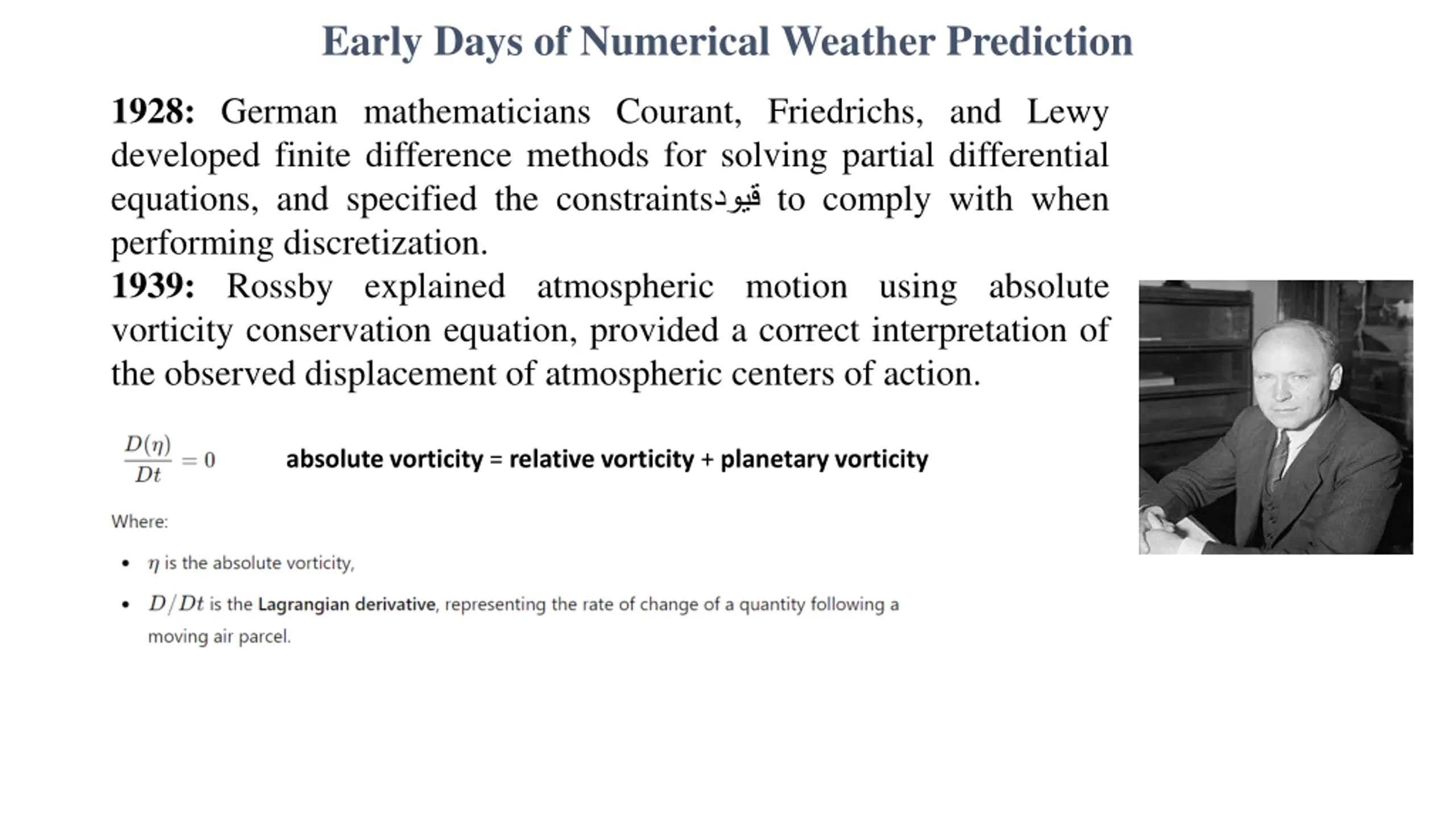 Early Days of Numerical Weather Prediction 1928: German mathematicians Courant, Friedrichs, and Lewy developed finite difference methods for solving partial differential equations, and specified the constraints to comply with when performing discretization. 1939: Rossby explained atmospheric motion using absolute vorticity conservation equation, provided a correct interpretation of the observed displacement of atmospheric centers of action. absolute vorticity = relative vorticity + planetary vorticity