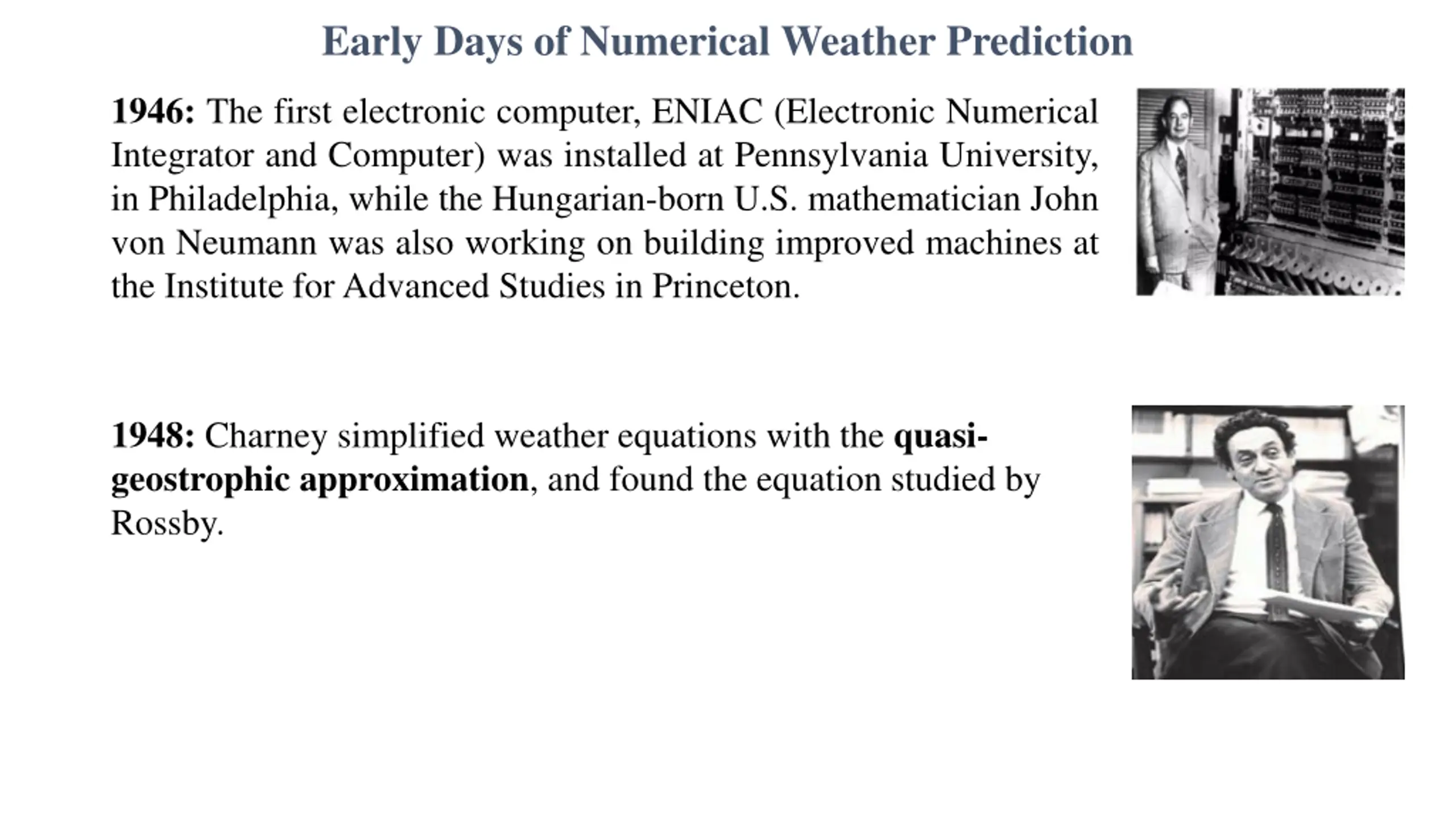 Early Days of Numerical Weather Prediction 1946: The first electronic computer, ENIAC (Electronic Numerical Integrator and Computer) was installed at Pennsylvania University, in Philadelphia, while the Hungarian-born U.S. mathematician John von Neumann was also working on building improved machines at the Institute for Advanced Studies in Princeton. 1948: Charney simplified weather equations with the quasi- geostrophic approximation, and found the equation studied by Rossby.