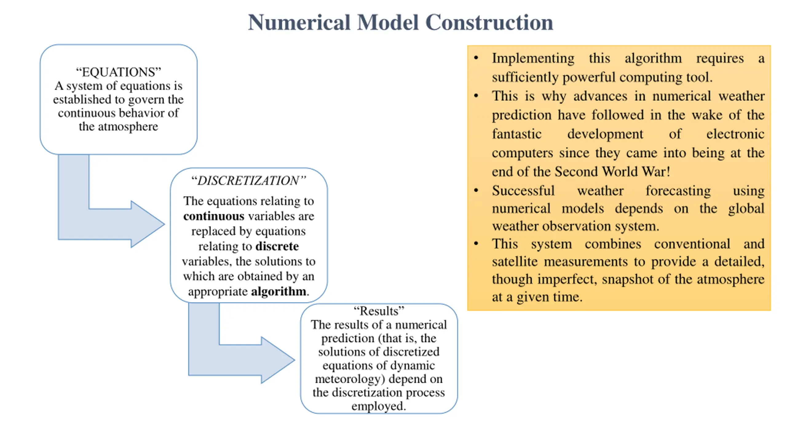 Numerical Model Construction Implementing this algorithm requires a sufficiently powerful computing tool. This is why advances in numerical weather prediction have followed in the wake of the fantastic development computers since they came into being at the end of the Second World War! Successful weather numerical models depends on the global weather observation system. This system combines conventional and satellite measurements to provide a detailed, though imperfect, snapshot of the atmosphere at a given time. EQUATIONS A system of equations is established to govern the continuous behavior of the atmosphere of electronic DISCRETIZATION The equations relating to continuous variables are replaced by equations relating to discrete variables, the solutions to which are obtained by an appropriate algorithm. forecasting using Results The results of a numerical prediction (that is, the solutions of discretized equations of dynamic meteorology) depend on the discretization process employed.