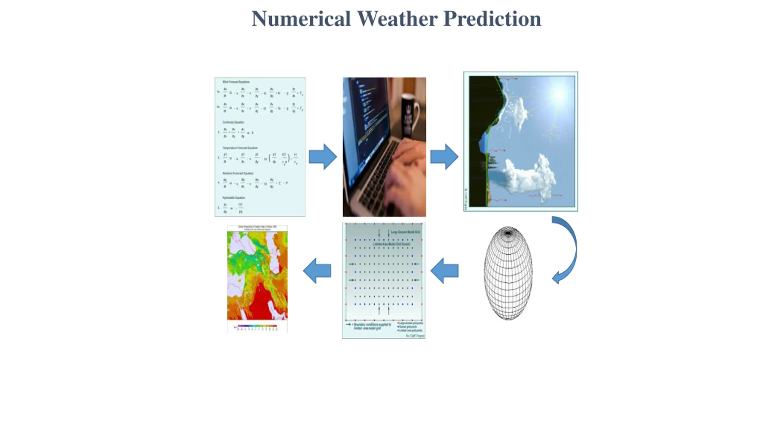 Numerical Weather Prediction A method of weather forecasting that employs: A set of equations that describe the flow of fluids, Which is translated into computer code, Combined with parameterizations of other processes, Then applied on a specific domain, and integrated, based on initial conditions and conditions at the domains boundaries